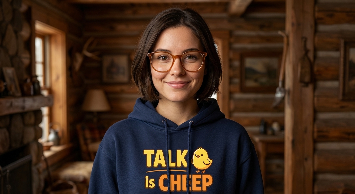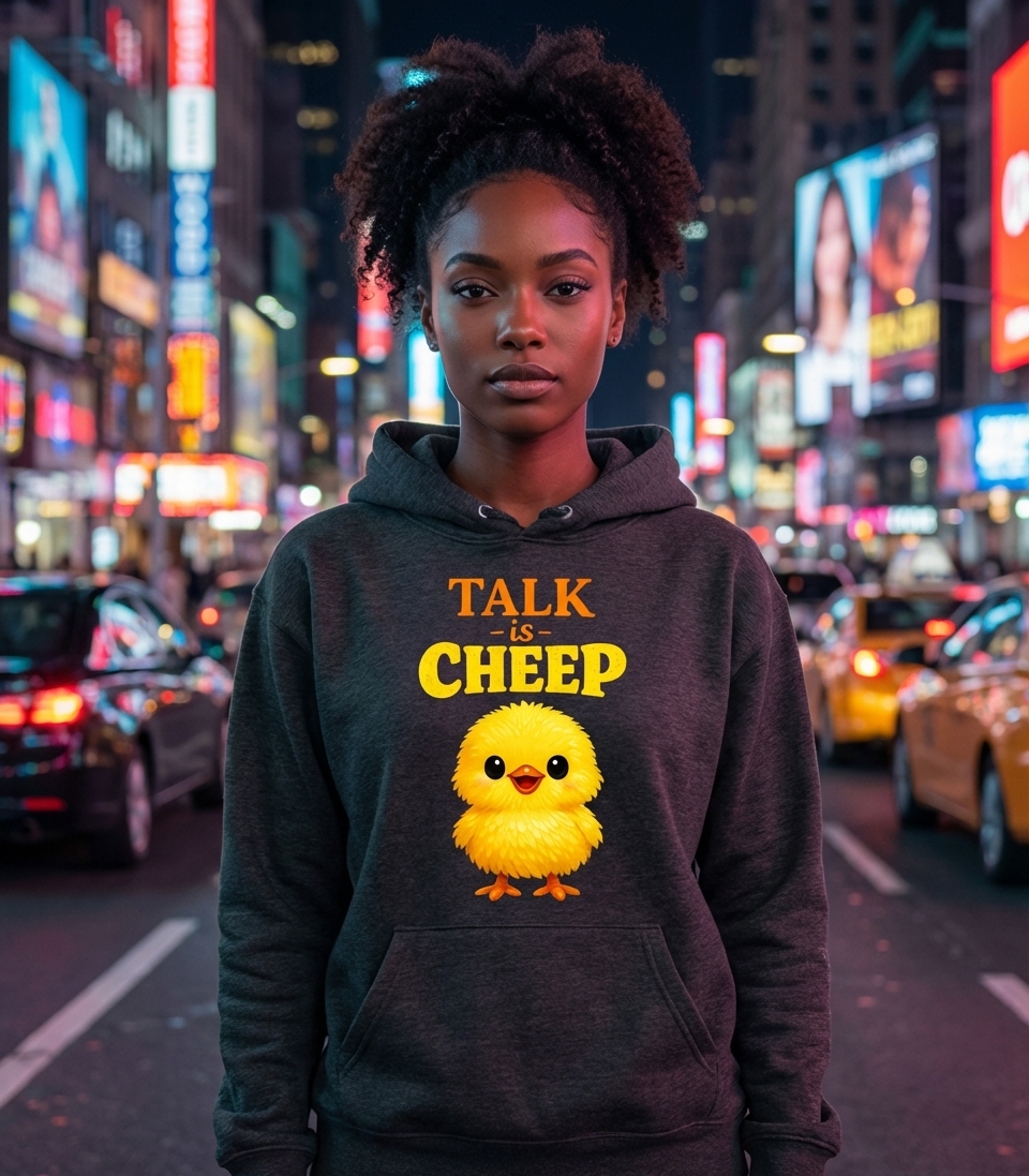 The phrase "Talk is Cheep" is a humorous twist on the common idiom "talk is cheap." The original saying means that it's easy to make promises or boast, but difficult to follow through with actions.