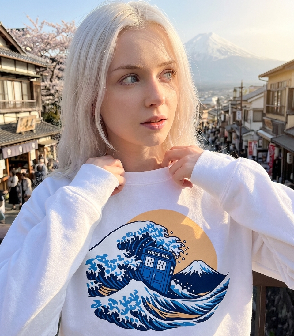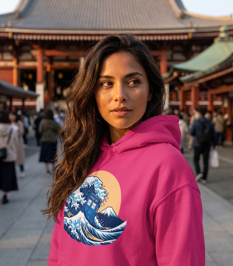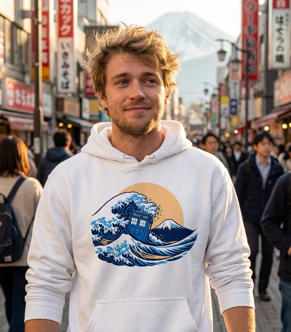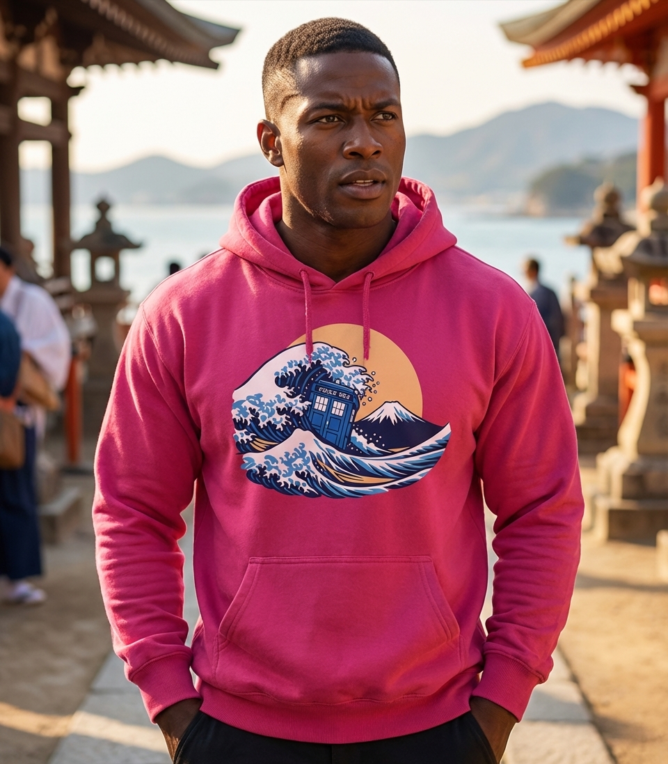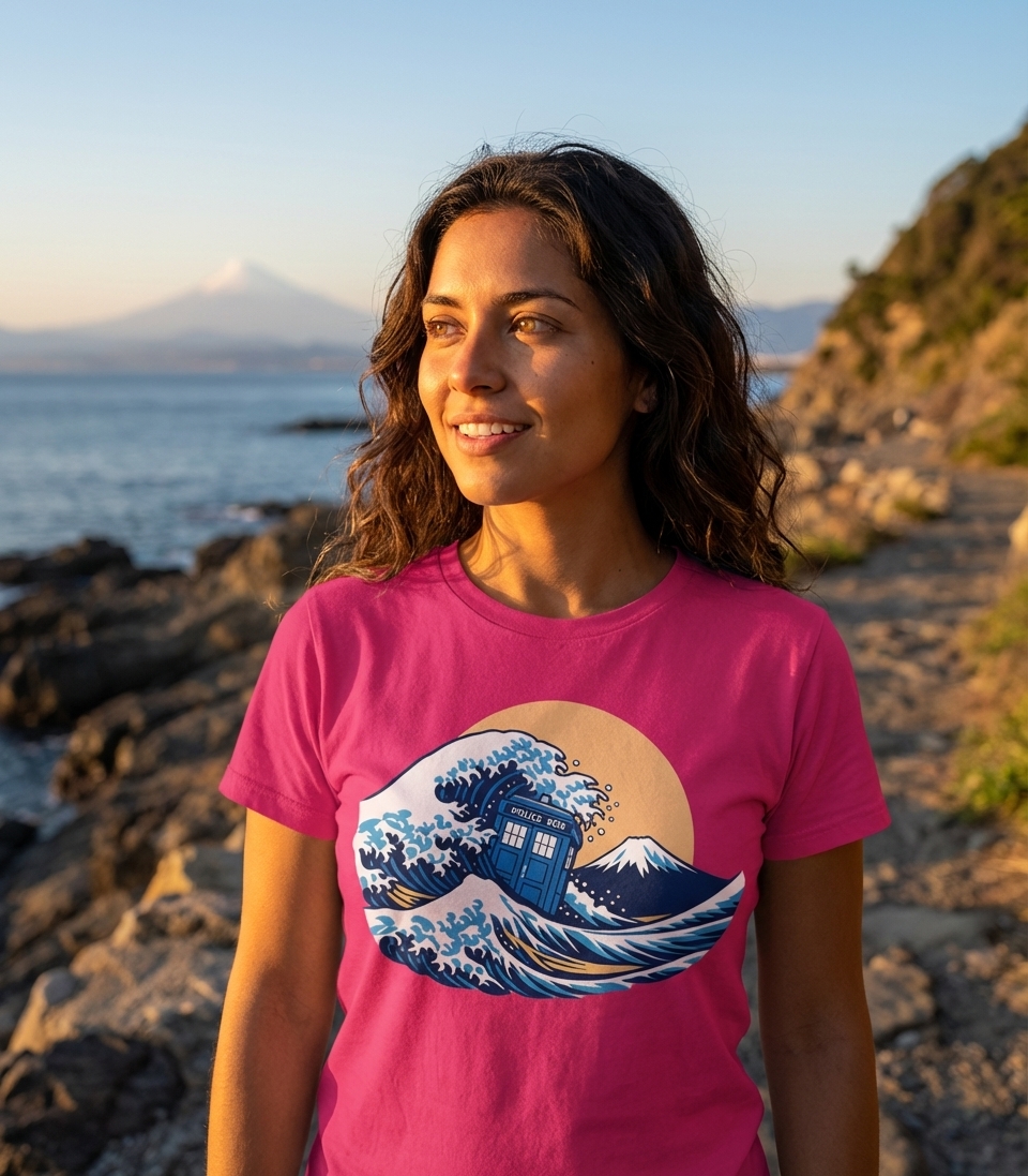 The artwork playfully combines elements of classic Japanese art with a beloved British science fiction icon, set against the backdrop of Mount Fuji and a vibrant sun. It's a visual delight for those who appreciate wit and imagination in their apparel.