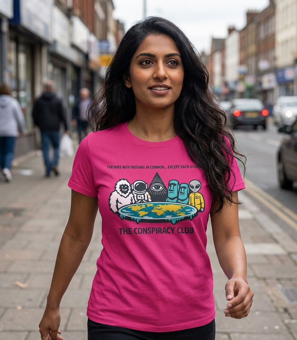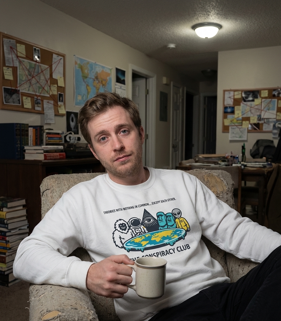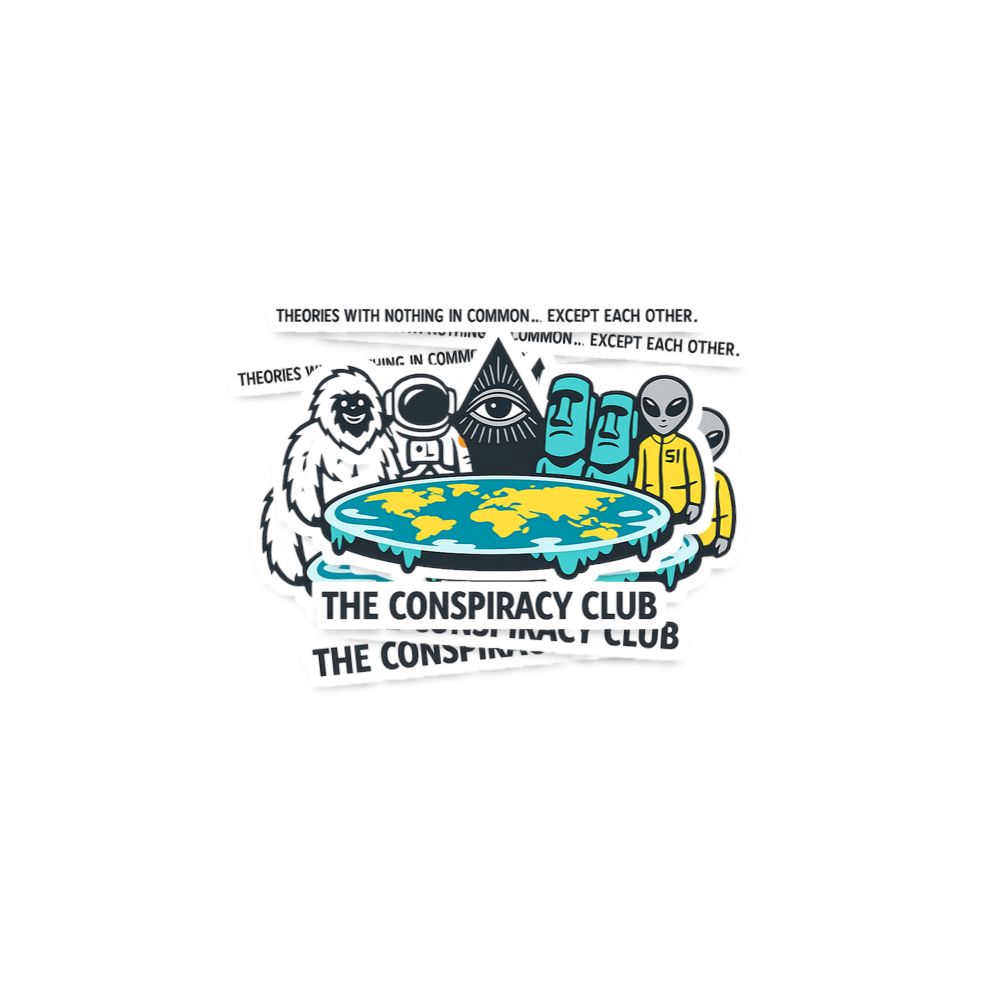 The artwork playfully brings together various figures and symbols commonly associated with popular conspiracy theories. From the mythical Bigfoot to the enigmatic Eye of Providence, these characters convene around a representation of a flat Earth, forming an exclusive 'Conspiracy Club'.