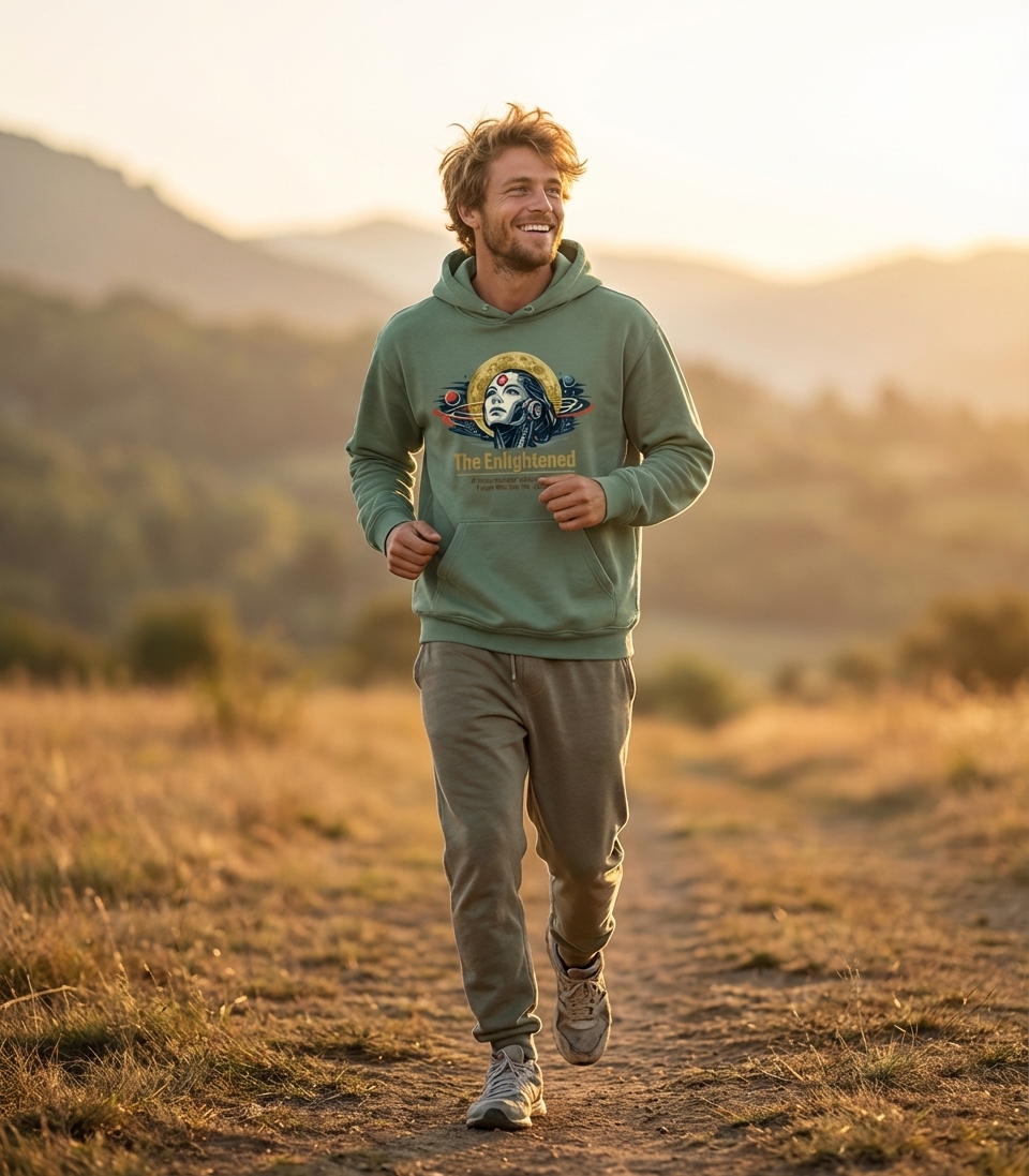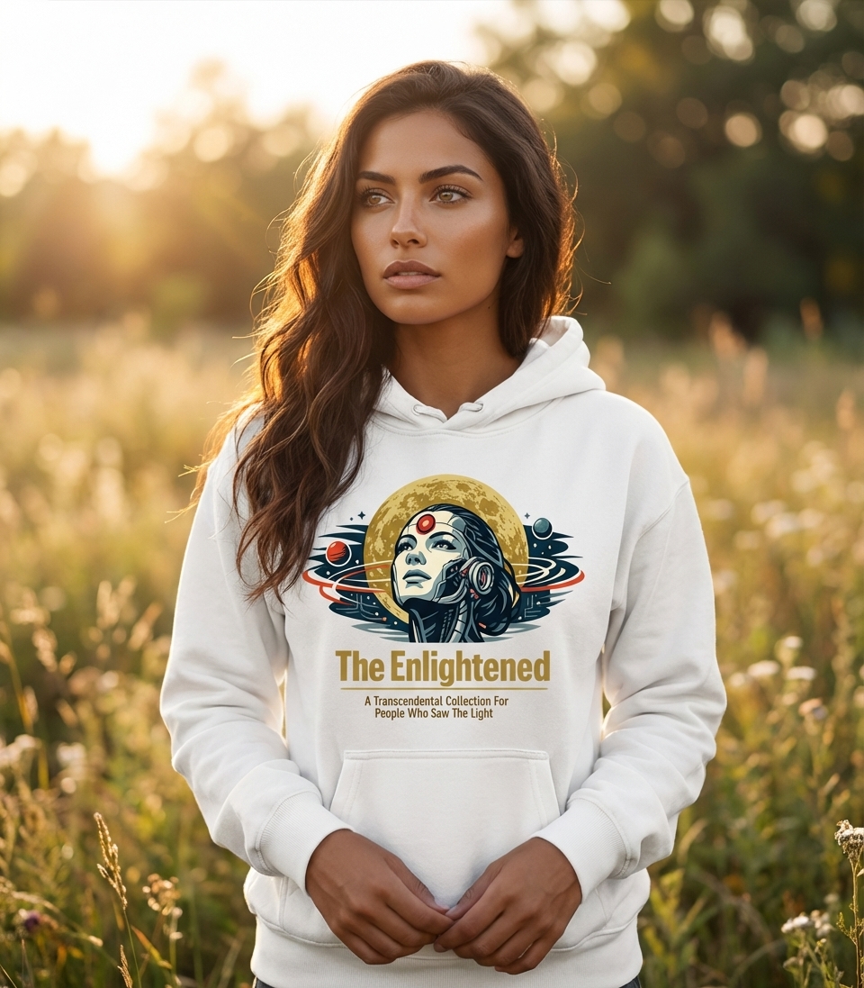 The 'Enlightened' phrase captures the lifestyle of spiritual seekers who explore existential questions, embrace futuristic visions, and look for deeper meaning.