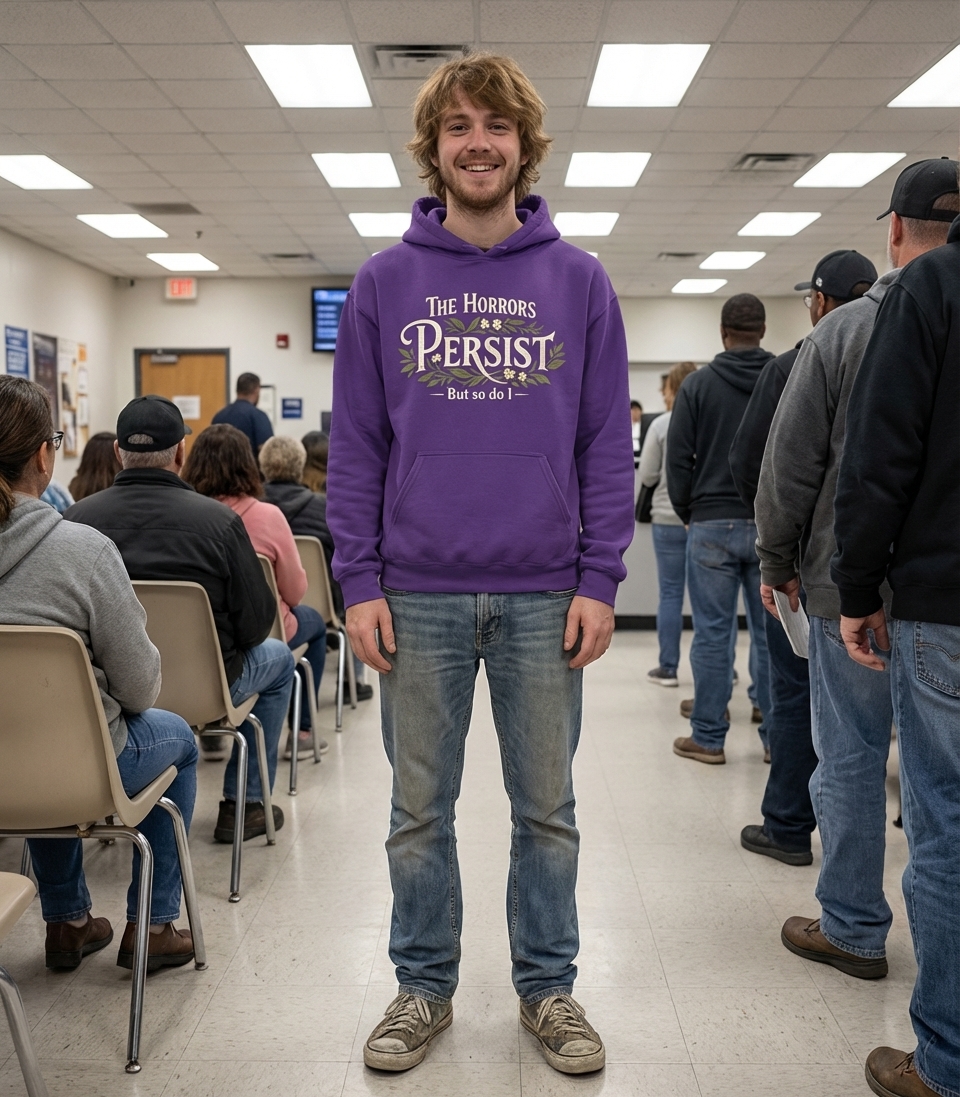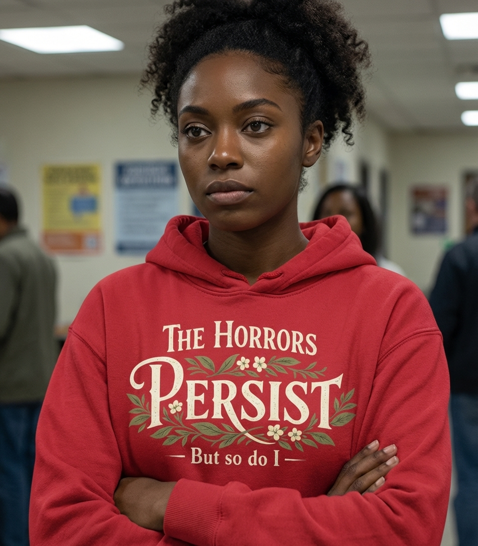 The 'The Horrors Persist' phrase captures the mindset of those who face life's absurdities with defiant, sarcastic resilience.