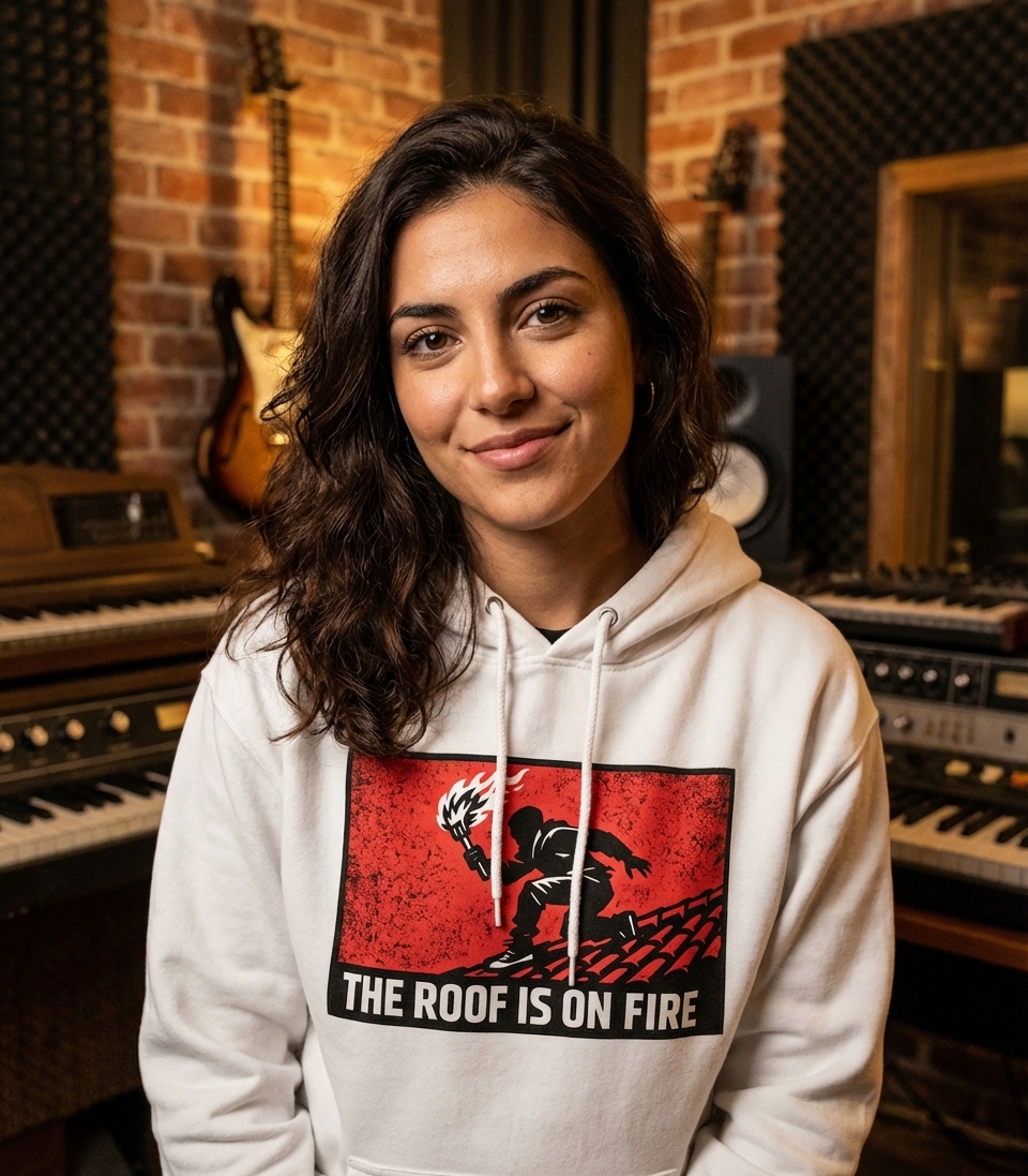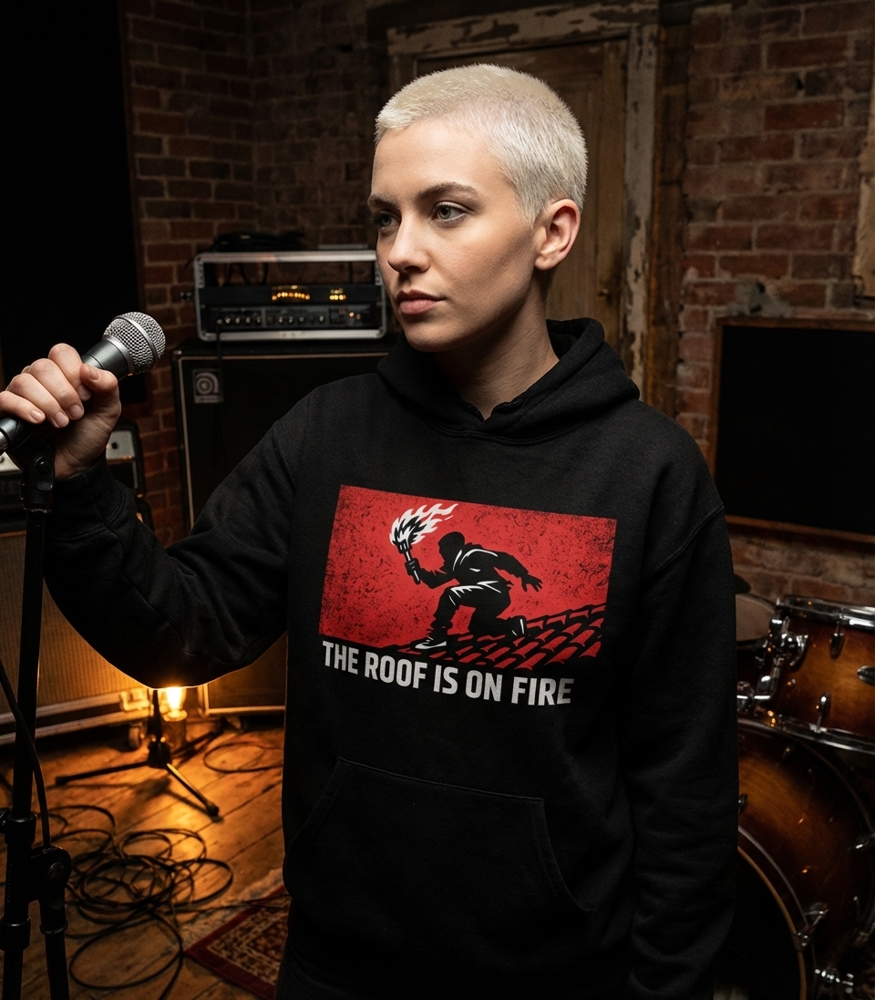 The "The Roof Is On Fire" phrase captures the lifestyle of passionate music enthusiasts and those who embrace energetic, chaotic vibes.