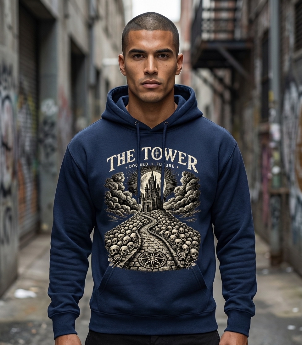 The "The Tower Doomed Future" phrase captures the aesthetic of those drawn to dark symbolism, mystical narratives, and the contemplation of fate.