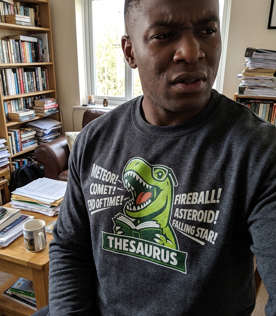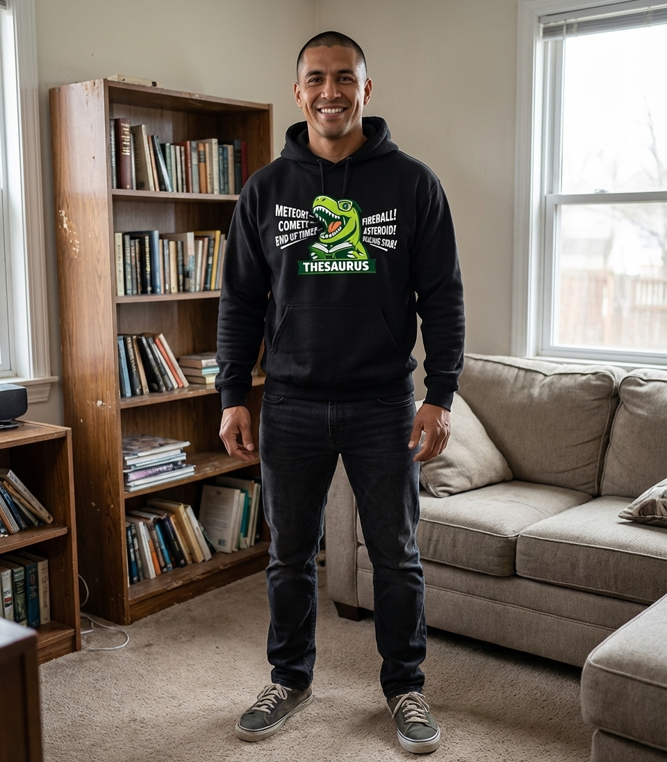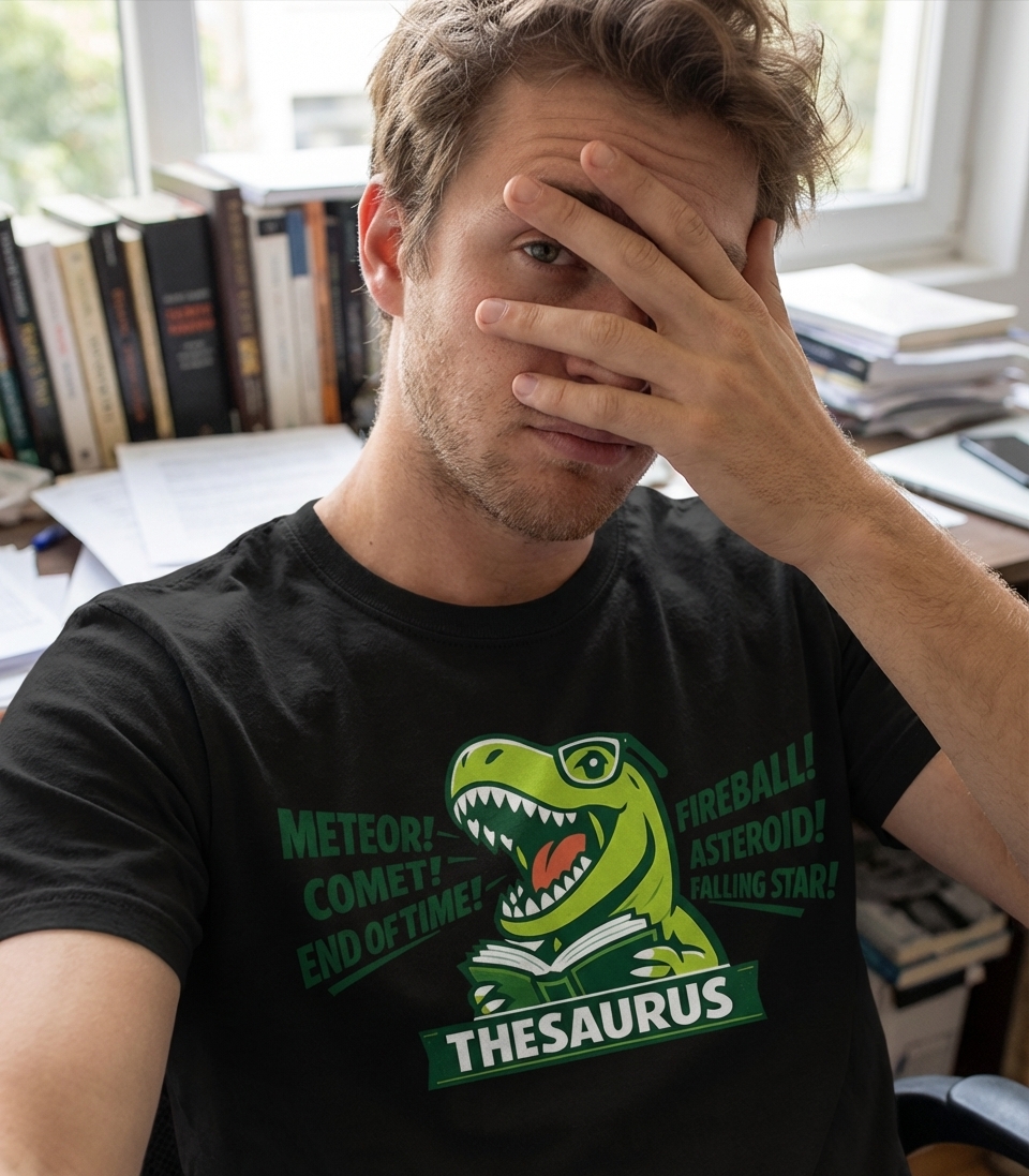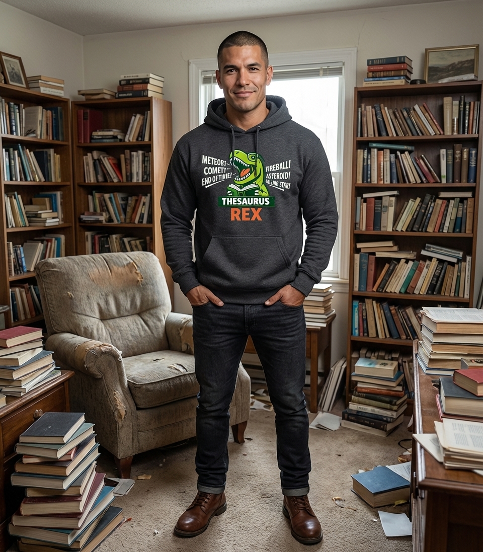 The core of this design is a pun, combining "T-Rex" with "thesaurus" to create "Thesaurus Rex." It humorously implies the dinosaur is diligently looking up alternative words for the very cosmic events that led to its kind's extinction. It’s a witty commentary on word usage and ironic situations.
