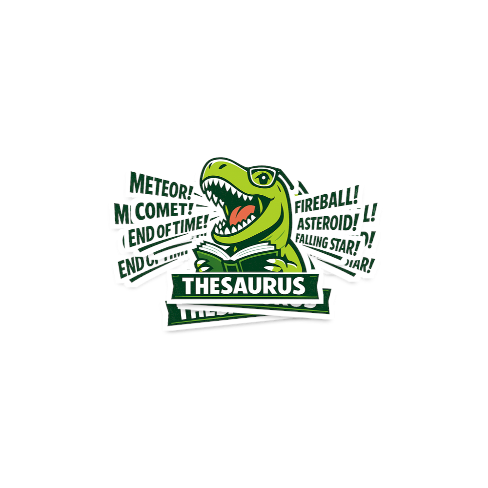 This unique design showcases a vibrant green T-Rex wearing scholarly glasses, engrossed in a thesaurus. The dinosaur's wide-open mouth shouts out synonyms for apocalyptic events like "Meteor! Comet! End of Time!" and "Fireball! Asteroid! Falling Star!" It's a lighthearted take on prehistoric history combined with a love for language.