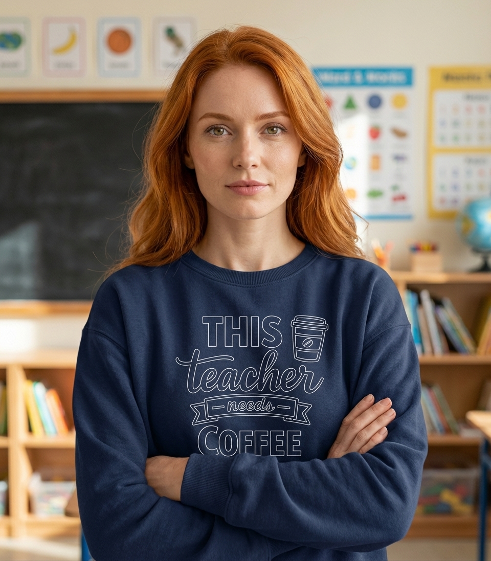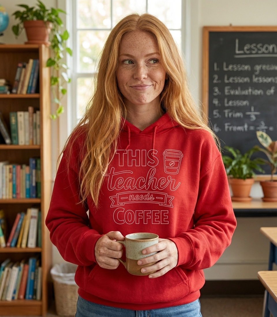 The 'This Teacher Needs Coffee' phrase captures the daily reality of dedicated educators who spend their days teaching, guiding, and inspiring students.