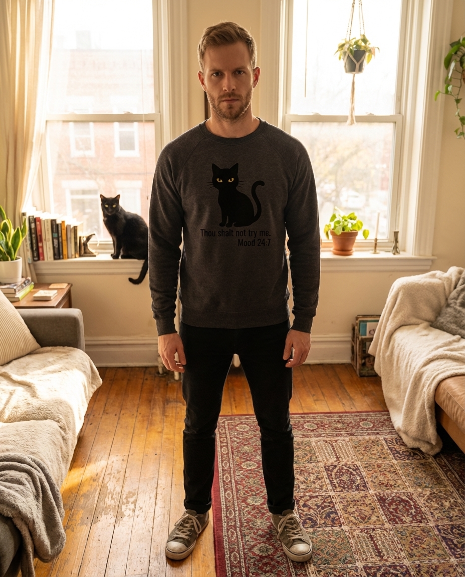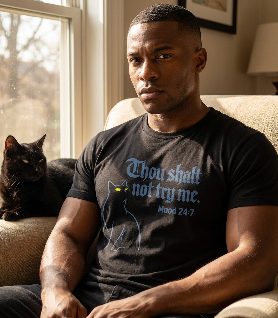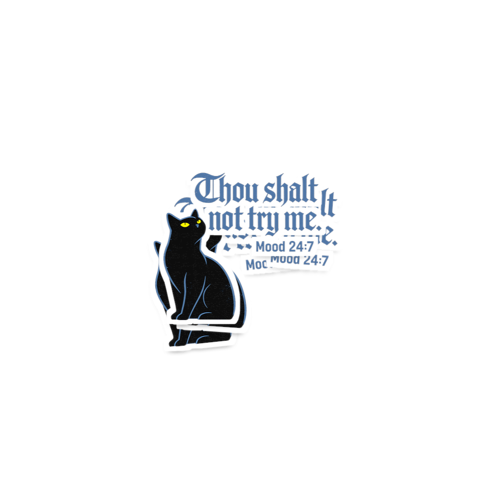 The artwork features a stylized black cat with vibrant yellow eyes, creating a striking contrast against the dark background. The use of a gothic, old English font for "Thou shalt not try me" adds to the design's dramatic and assertive mood, complemented by the modern "Mood 24:7" in a simpler serif font. The overall style is flat graphic, conveying a bold and humorous statement.
