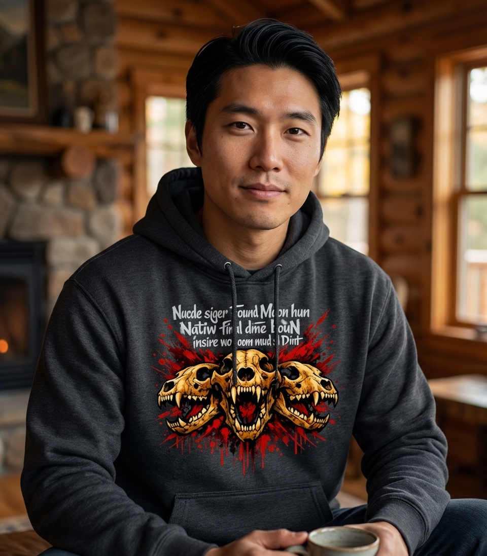 The textual elements in this design serve as an abstract visual complement to the central skull imagery, contributing to an overall enigmatic and stylized aesthetic rather than conveying a literal message. The primary emphasis is on the powerful and symbolic visual representation of strength and danger.