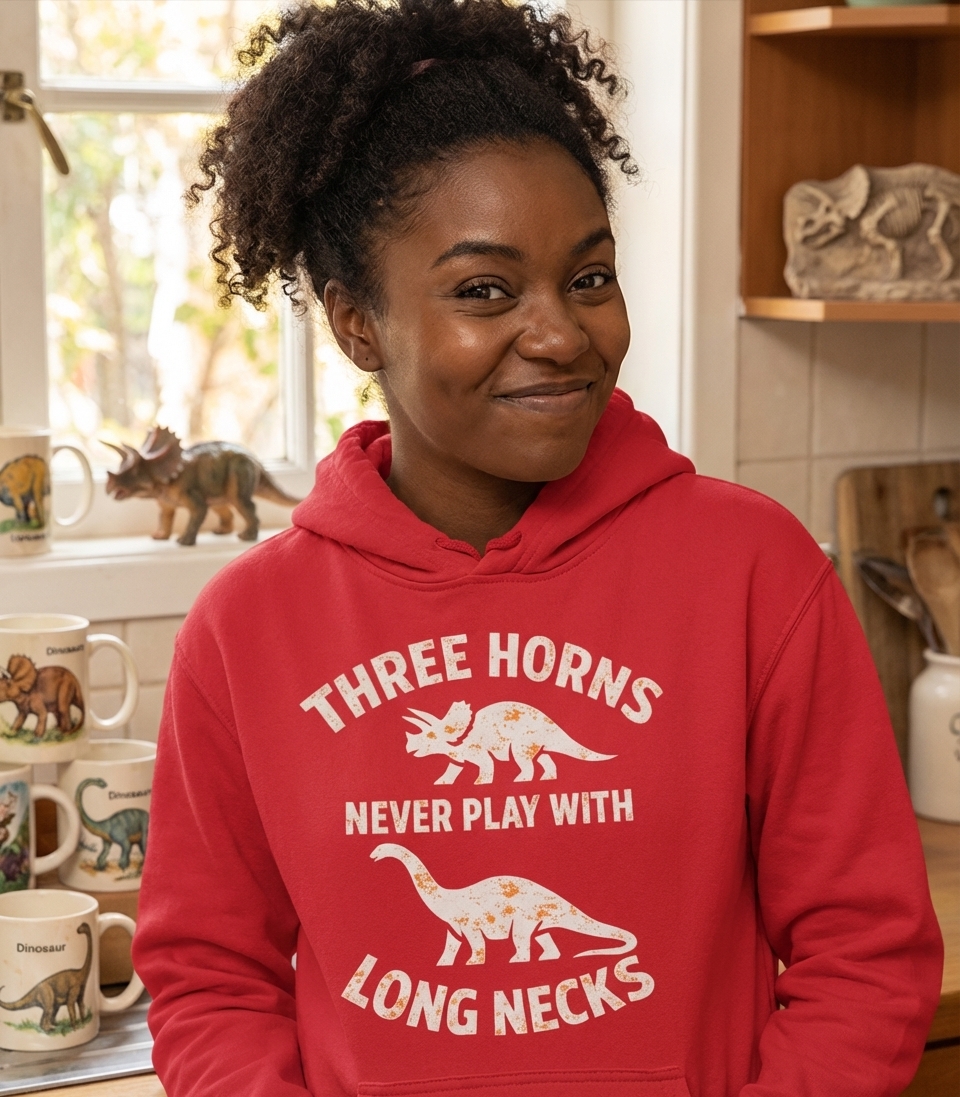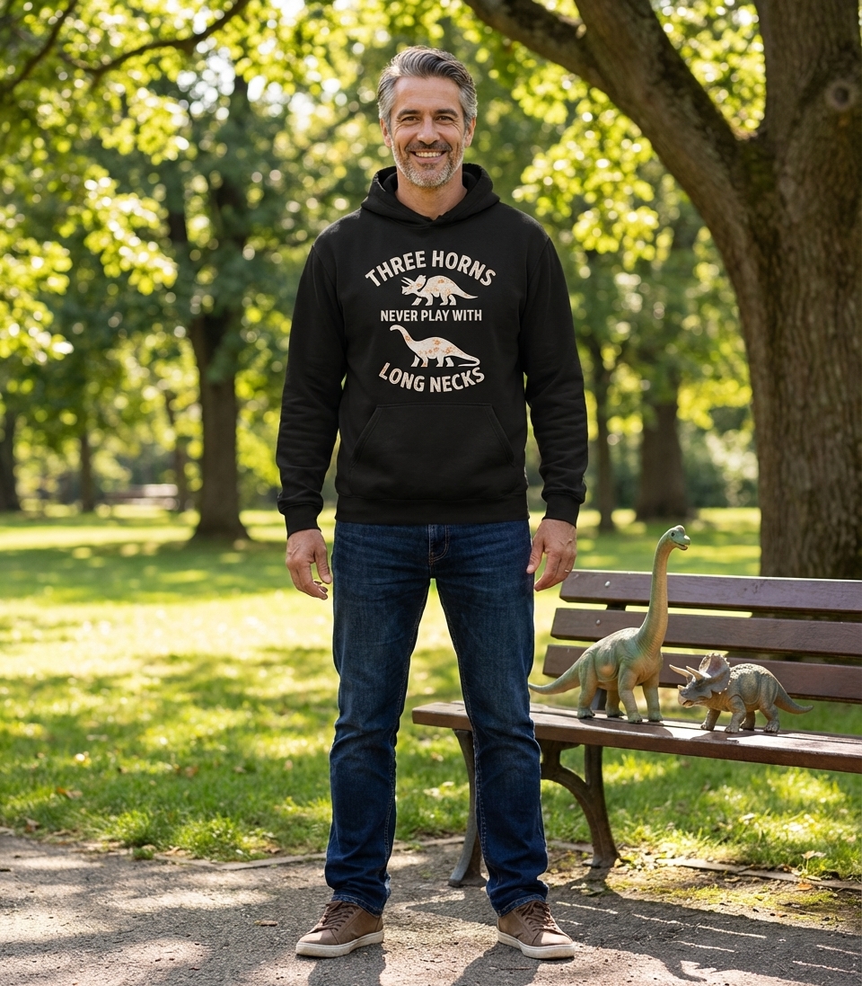 The phrase "Three Horns Never Play With Long Necks" creates a humorous, fictional rivalry between two distinct types of dinosaurs. It's a lighthearted take on social dynamics, playfully suggesting that these different prehistoric giants keep to their own kind. It taps into a nostalgic appreciation for classic dinosaur imagery and simple, witty jokes.