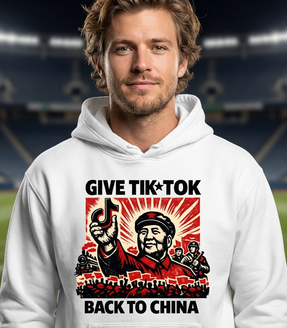 This graphic tee features a striking design reminiscent of classic communist propaganda posters. It prominently displays a figure resembling Mao Zedong, holding up the modern TikTok logo. The bold text beneath reads, 'Give TikTok Back to China', combining historical political imagery with a contemporary digital issue.