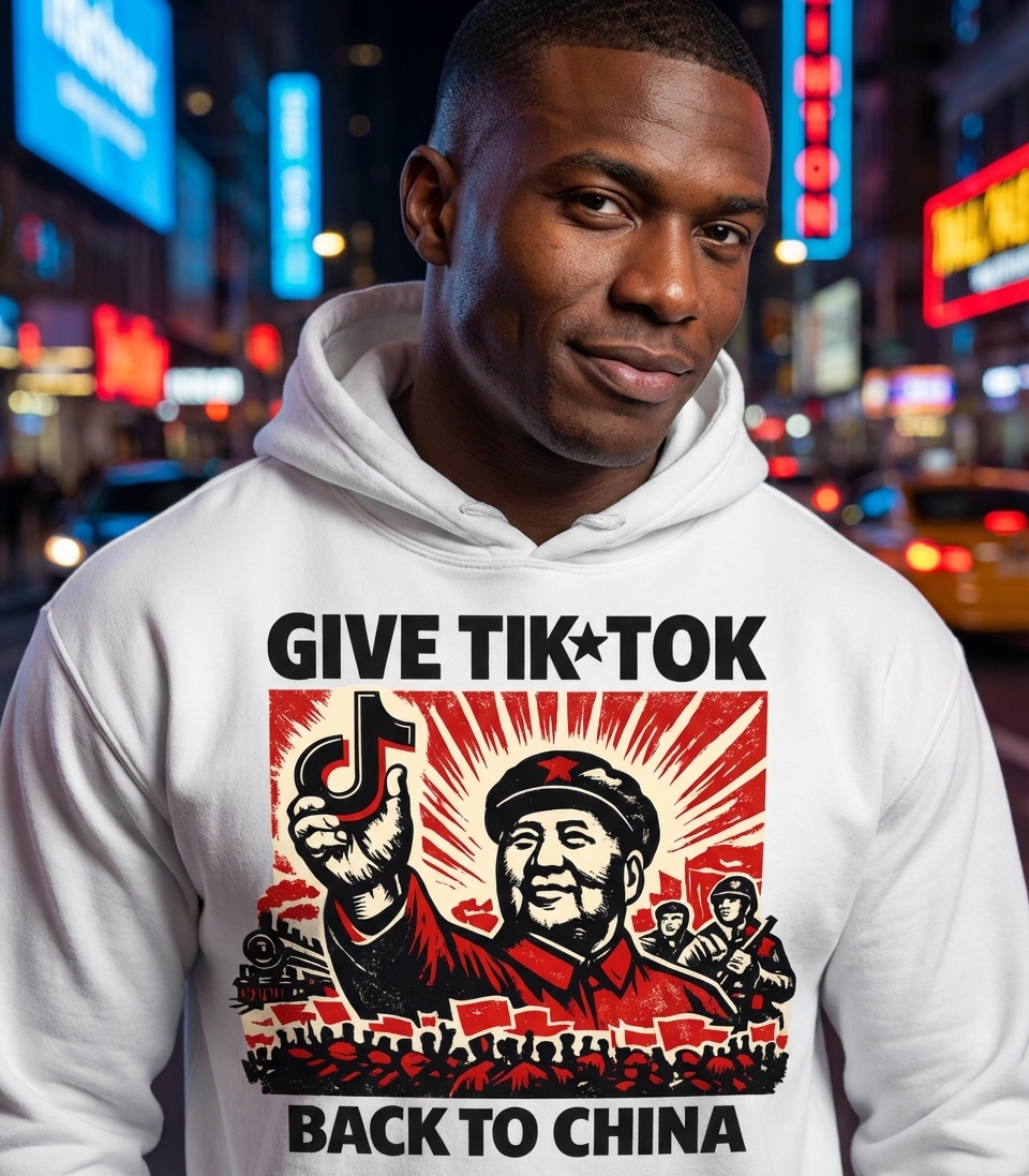 The phrase 'Give TikTok Back to China' serves as a satirical commentary on the ongoing geopolitical discussions surrounding the popular social media platform. It humorously references debates about TikTok's Chinese ownership, data security, and its presence in global markets. The design uses irony to highlight the cultural and political implications of digital applications.