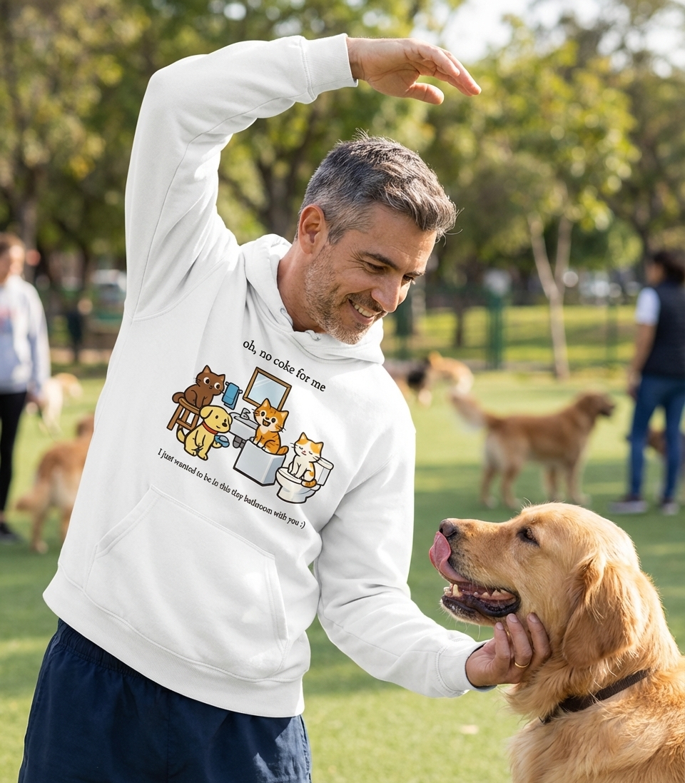 The artwork playfully combines two humorous elements. The phrase "oh, no coke for me" adds a touch of quirky, unexpected humor, while the line "I just wanted to be in this tiny bathroom with you :)" perfectly encapsulates the unwavering companionship and sometimes overwhelming presence of our beloved pets.