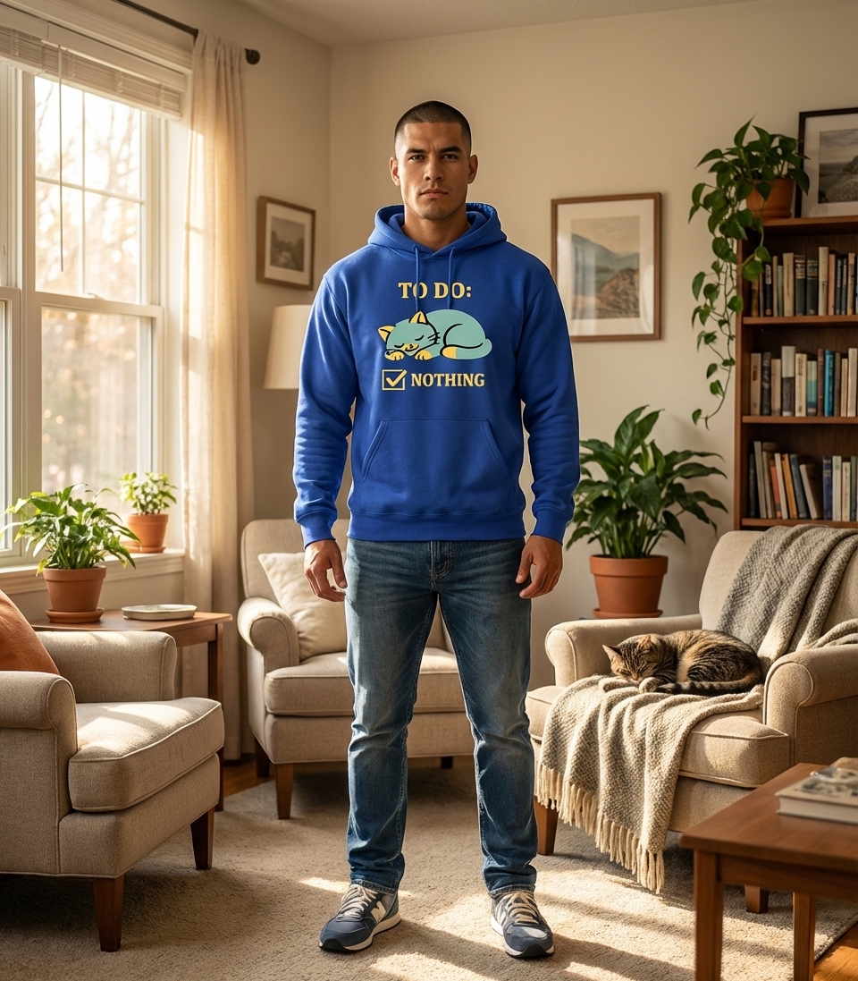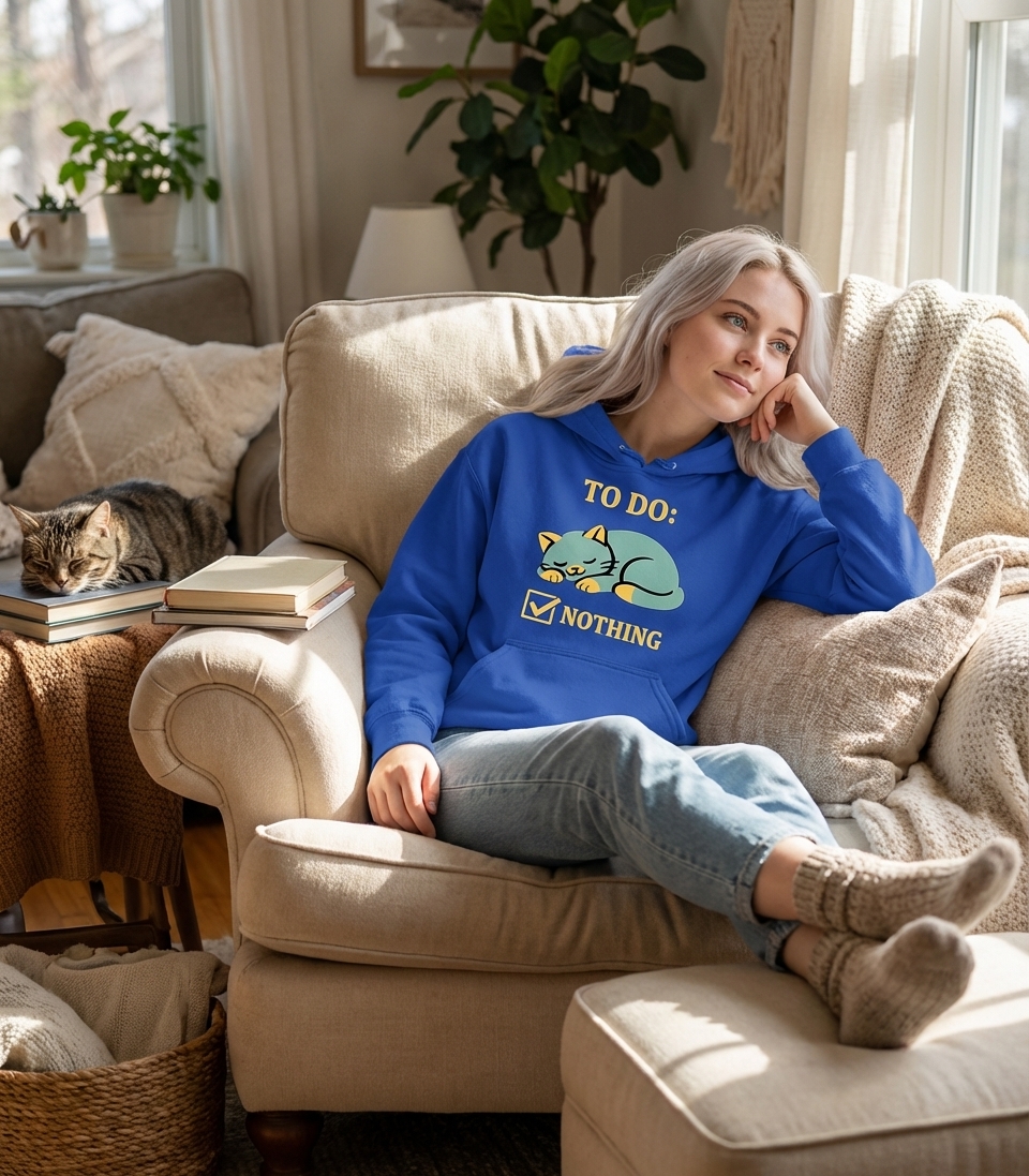 The phrase "TO DO: NOTHING" is a playful commentary on taking a break from responsibilities and embracing downtime. It resonates with anyone who dreams of a day without obligations, perfectly embodied by the effortlessly relaxed cat.
