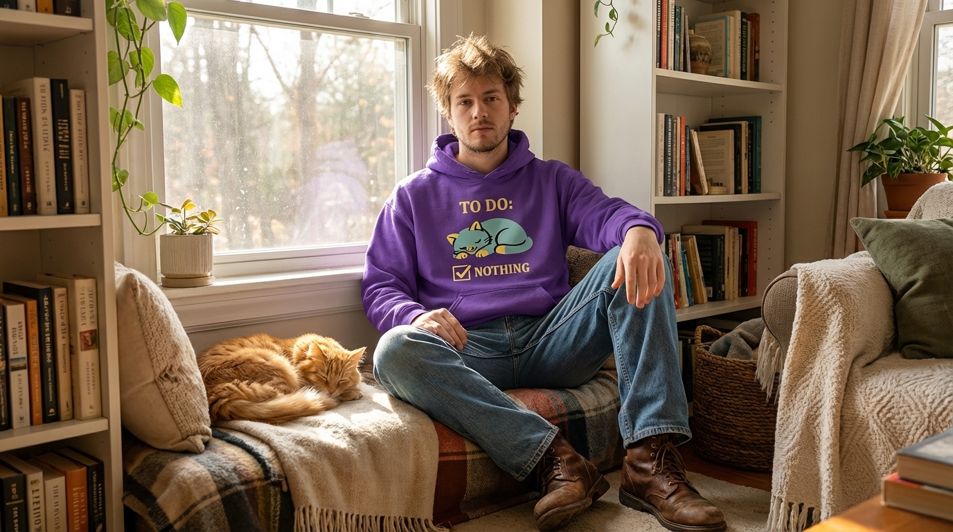 The 'TO DO: NOTHING' phrase captures the lifestyle of dedicated cat enthusiasts and introverts who spend their days napping, relaxing, and avoiding responsibilities.