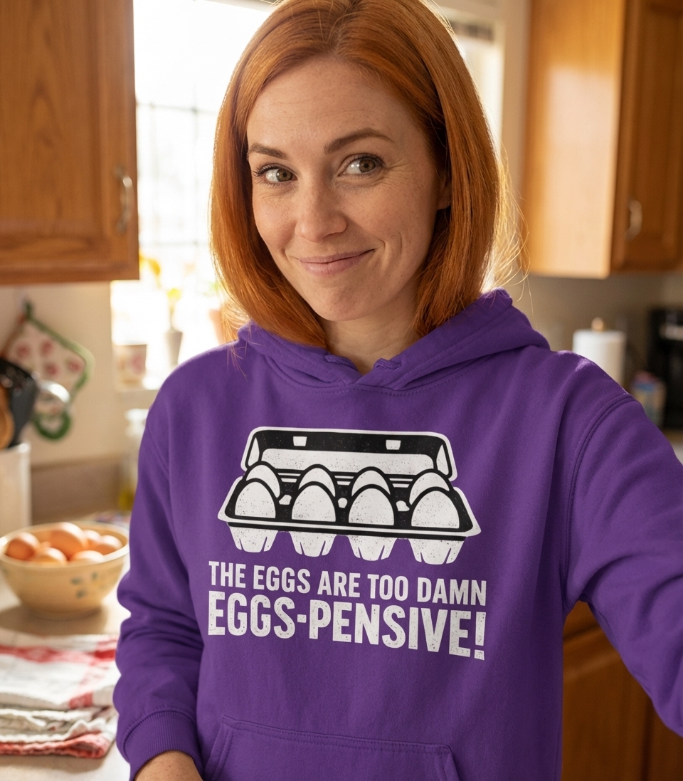 The phrase "THE EGGS ARE TOO DAMN EGGS-PENSIVE!" is a playful pun on the word "expensive." It cleverly incorporates the subject of eggs into the complaint about their cost. This reflects a common, lighthearted frustration many people share regarding rising grocery prices, particularly for staples like eggs.