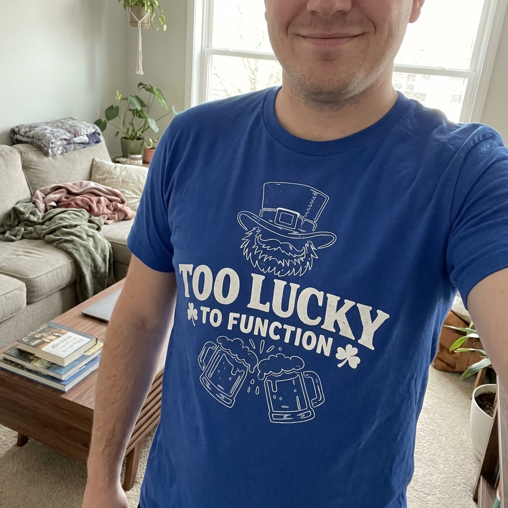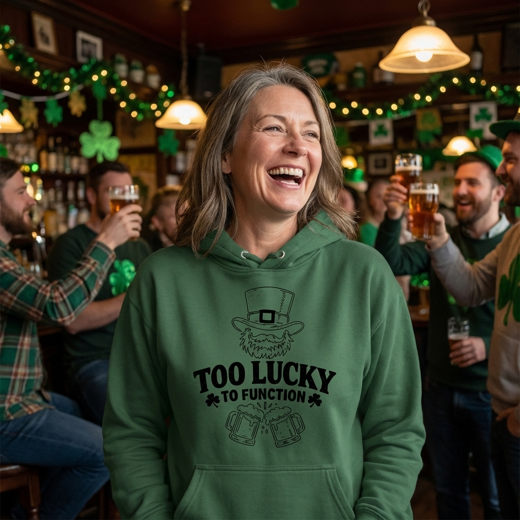 The phrase "Too Lucky To Function" is a witty take on feeling overwhelmed by good fortune, often interpreted humorously in the context of St. Patrick's Day celebrations.