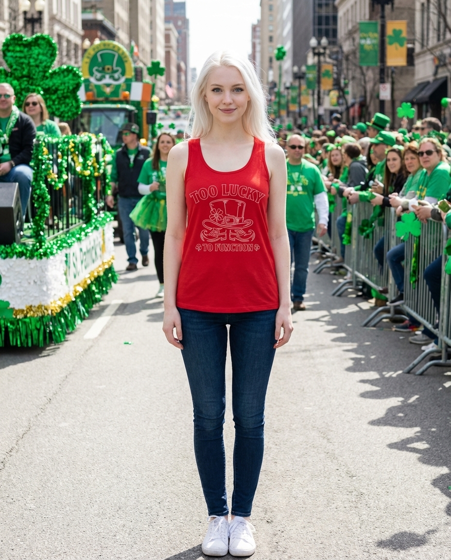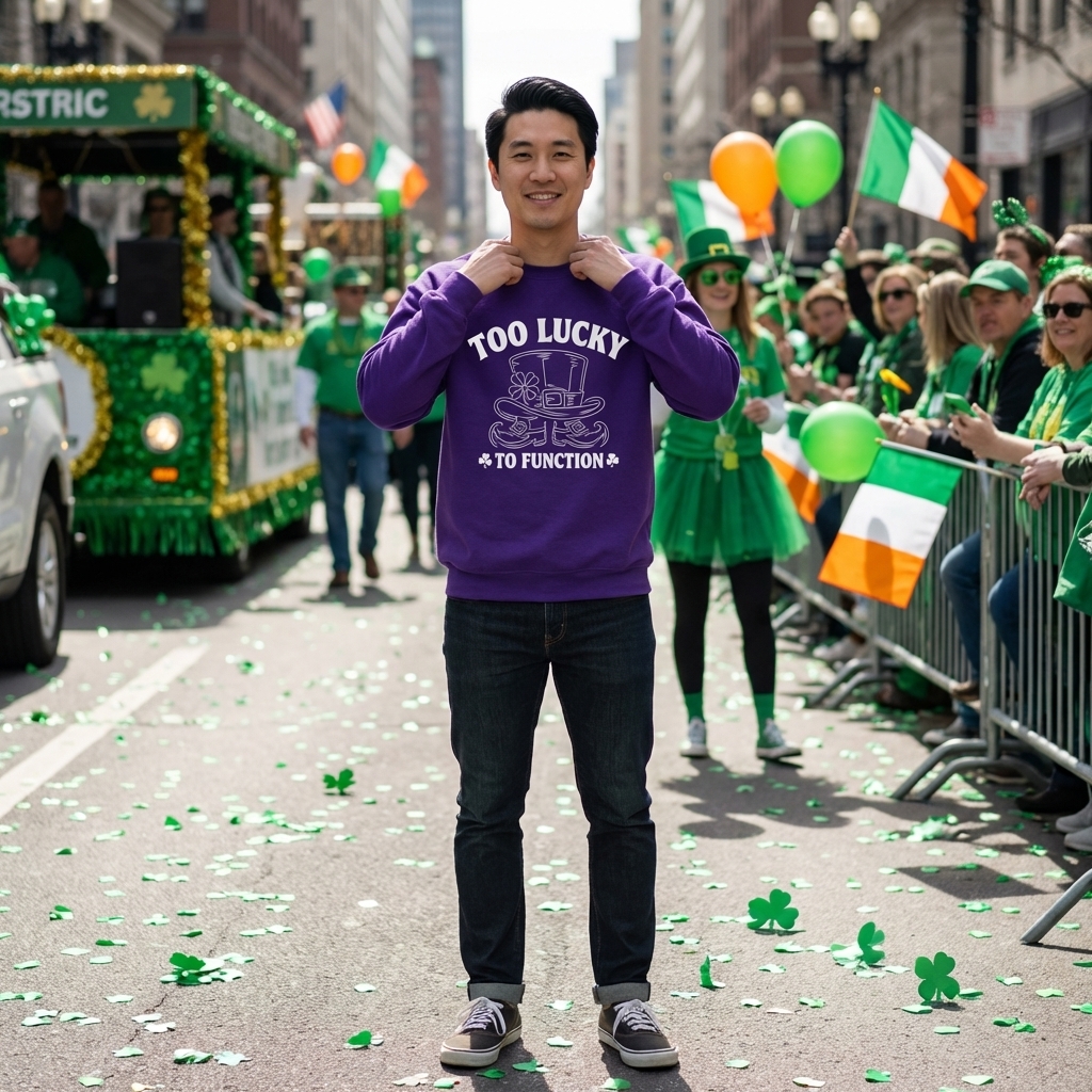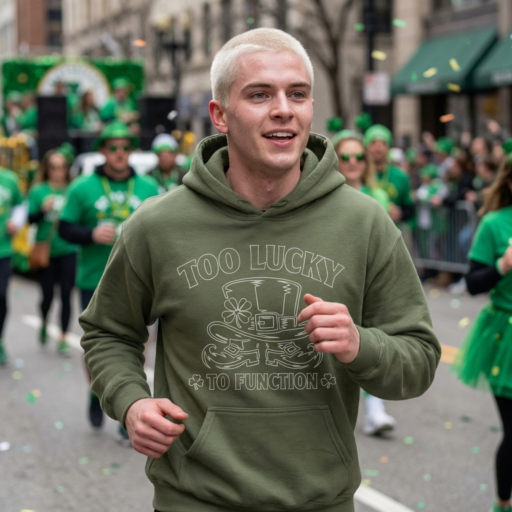 The 'Too Lucky To Function' phrase captures the lively spirit of St. Patrick's Day celebrants who enjoy a bit of mischievous luck, festive gatherings, and cheerful revelry.