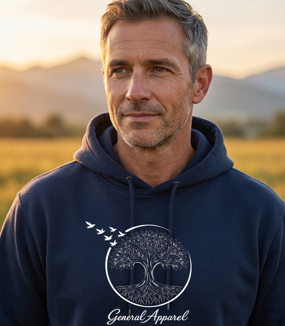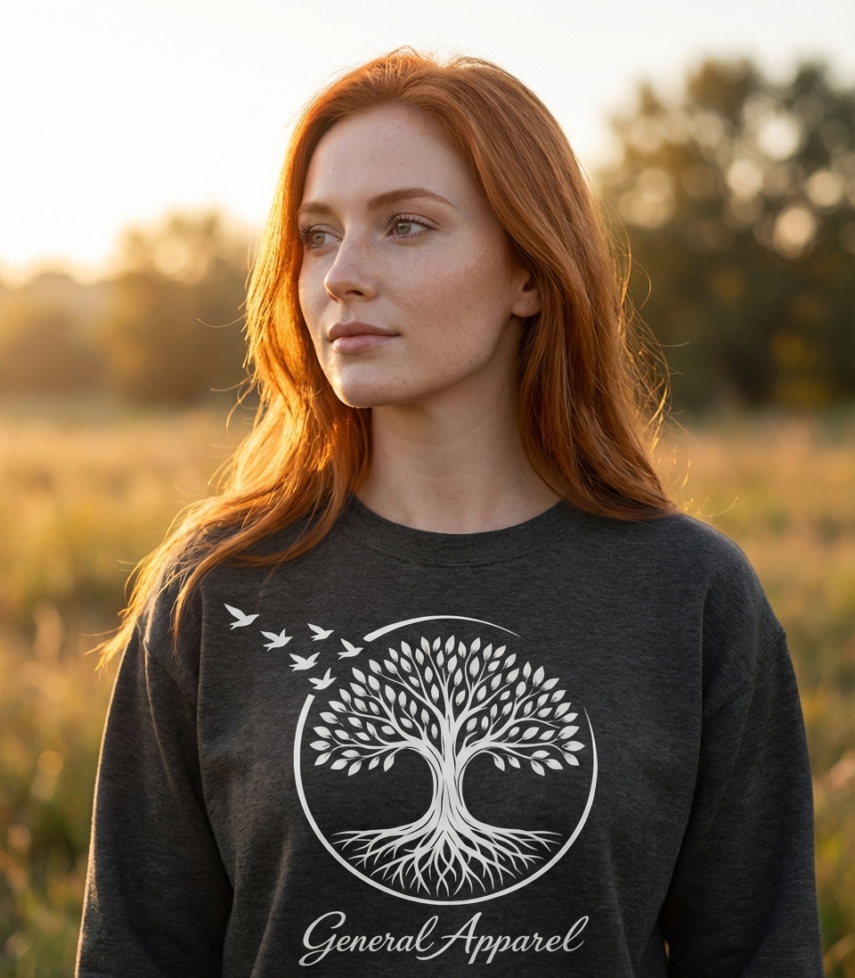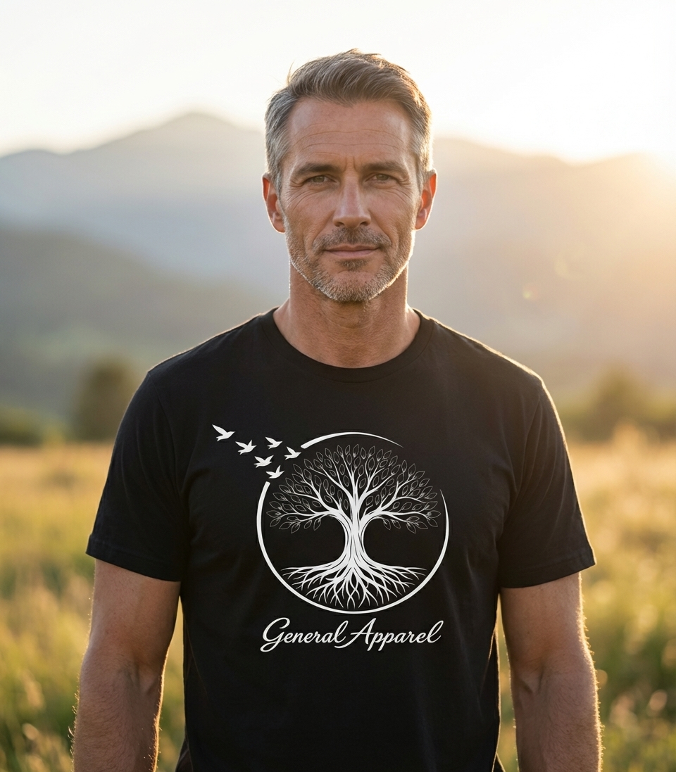 This striking artwork showcases a detailed white silhouette of a lush Tree of Life, complete with intricate roots and a full canopy of leaves. It is elegantly framed within a clean circular border, from which several minimalist birds are depicted taking flight towards the upper left. The text "General Apparel" is positioned below the main graphic.