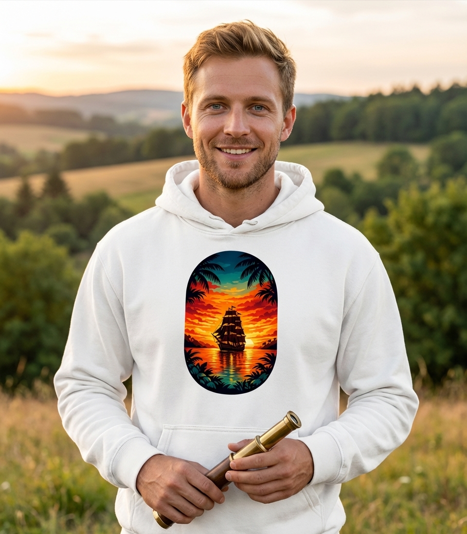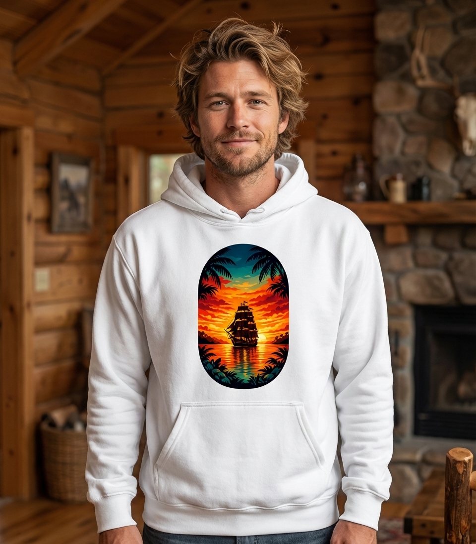 This striking graphic features a classic tall ship sailing serenely across a calm ocean at sunset. The vibrant sky, framed by tropical palm trees and foliage, evokes a sense of peace and adventure.