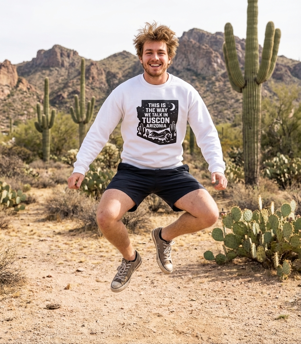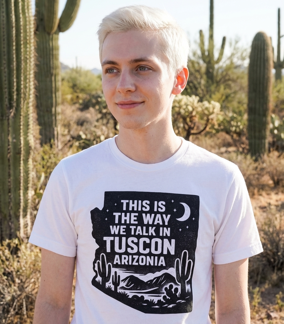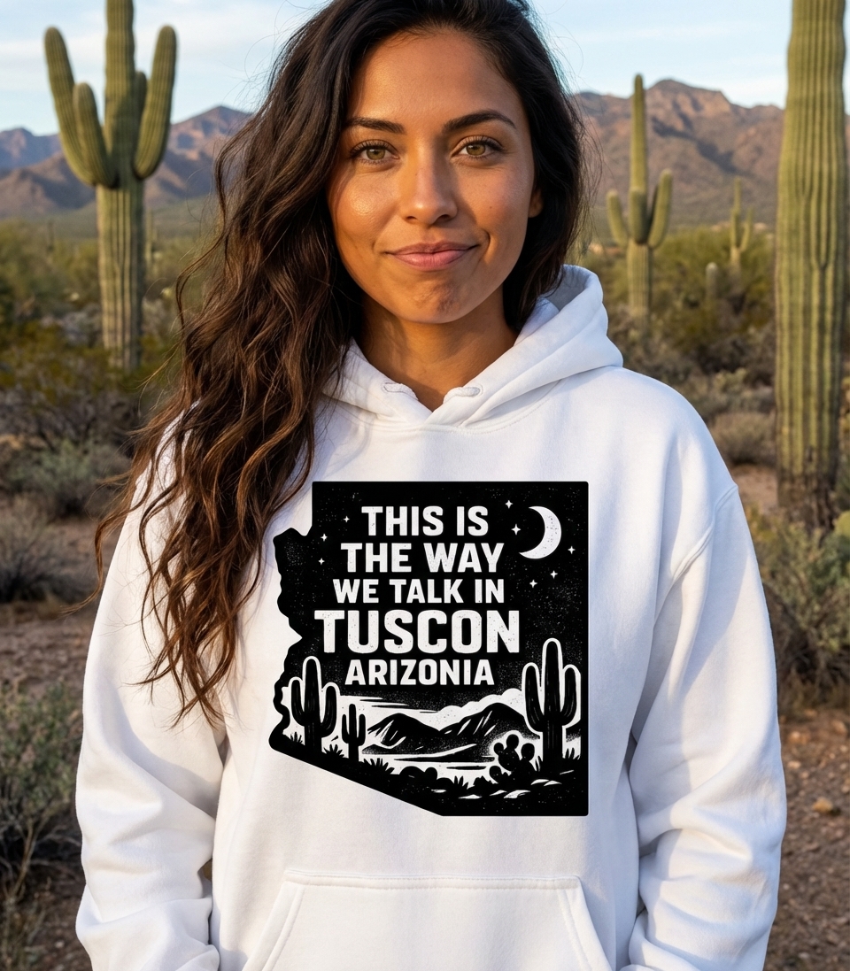 The 'Tuscon Arizonia' phrase captures the lifestyle of proud Arizonans who embrace their local dialect, desert beauty, and unique community spirit.