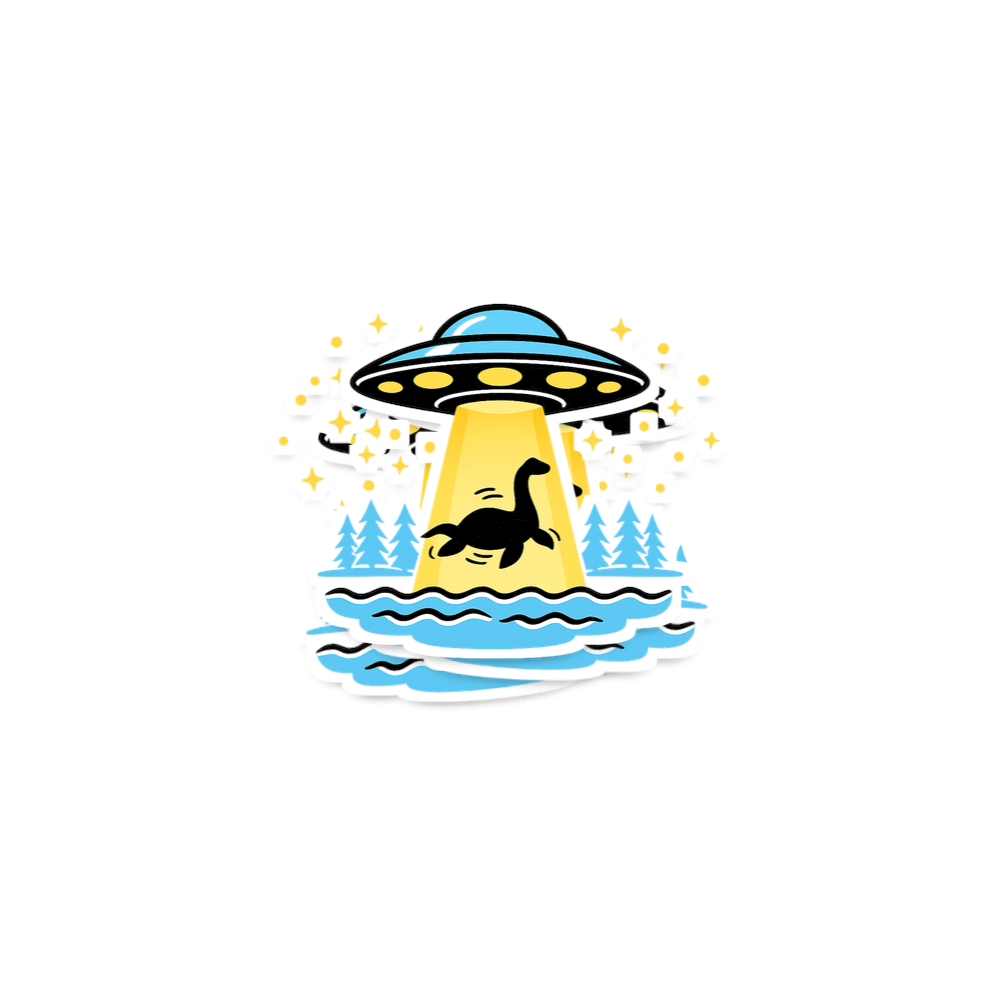 This playful graphic brings together two iconic mysteries: the legendary Loch Ness Monster and a classic flying saucer. The scene depicts a UFO beaming down a ray of light, gently abducting Nessie from the calm waters of a Scottish loch, surrounded by pine trees under a starry night sky. It's a whimsical illustration that sparks curiosity and a smile.