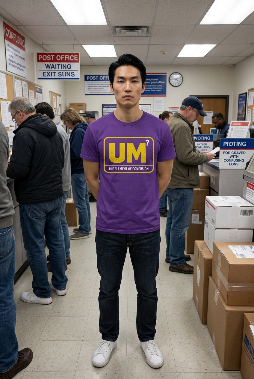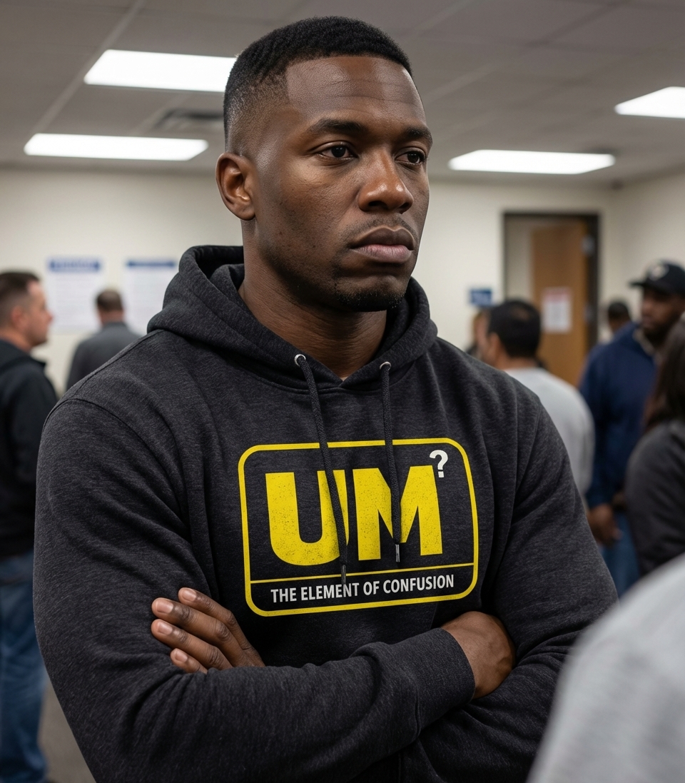 This design cleverly reimagines the periodic table of elements with a humorous twist. It features "UM?" as the symbol for "The Element of Confusion," presented in a bold, distressed yellow font within a classic rectangular element box.