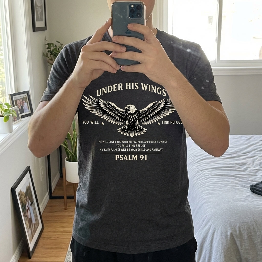 This design features a majestic eagle with outstretched wings, symbolizing strength and protection. It is paired with powerful scripture from Psalm 91, offering a message of unwavering faith and security.