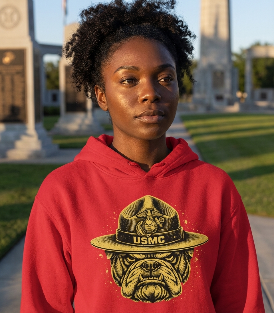 The phrase "USMC" stands for United States Marine Corps, representing a proud military branch known for its elite fighting force and unwavering commitment. The bulldog symbolizes the tenacity, courage, and fighting spirit of the Marines, earning them the nickname "Devil Dogs." The Drill Instructor's hat signifies authority, discipline, and the rigorous training that forges a Marine.