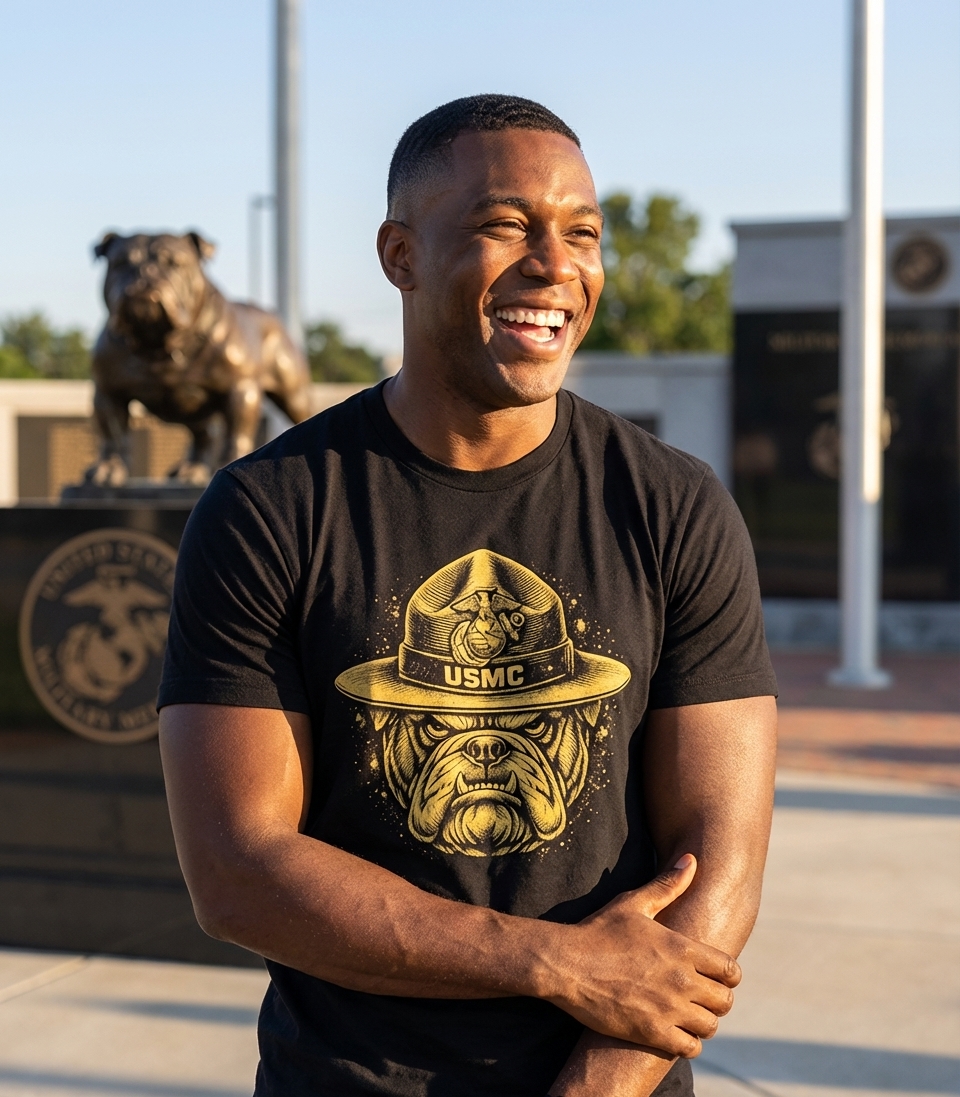 This graphic features a stern-faced bulldog wearing the distinctive campaign hat of a U.S. Marine Corps Drill Instructor, complete with the Eagle, Globe, and Anchor emblem. The artwork is rendered in a gritty, gold and black style, evoking a sense of enduring strength and military tradition. It merges the beloved "Devil Dog" mascot with the formidable presence of Marine leadership.