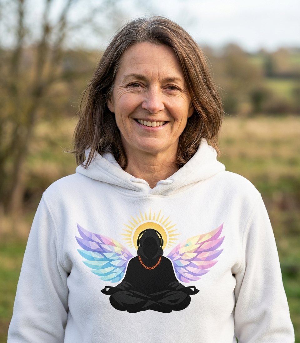 The 'Music Meditation Angel' design captures the lifestyle of music enthusiasts who find peace, creativity, and spiritual connection through their beats and introspection.