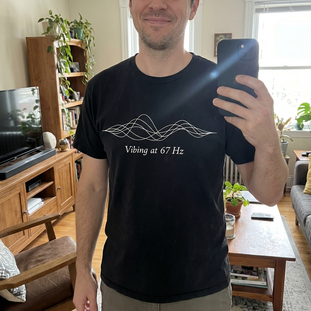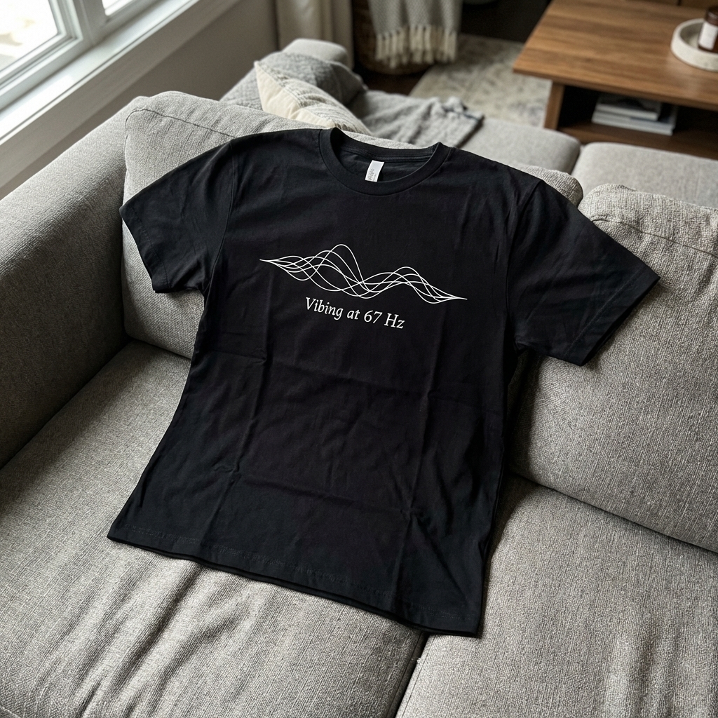 got this shirt and it's seriously so comfy, like really good quality fabric. the 'Vibing at 67 Hz' design is just so unique and perfect for when i wanna feel chill but still have a little something interesting going on. absolutely dig it.