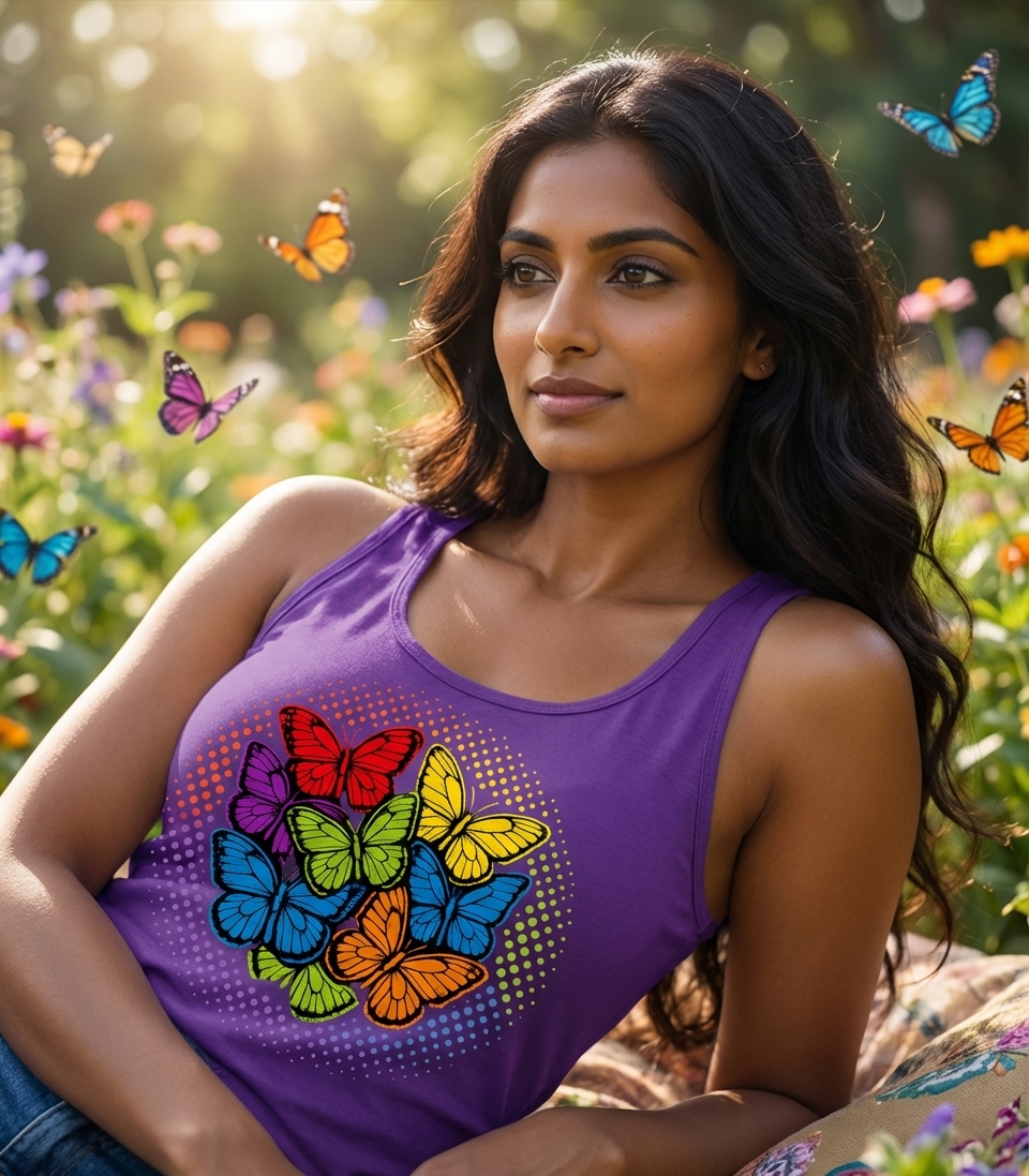 The design primarily focuses on the visual appeal of butterflies and the spectrum of colors. It evokes feelings of joy, transformation, and the diverse beauty found in the natural world.