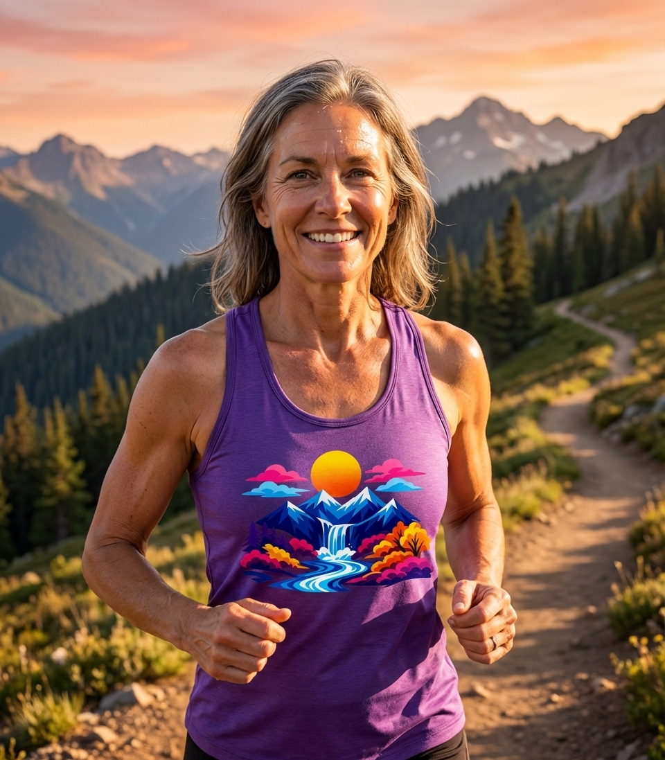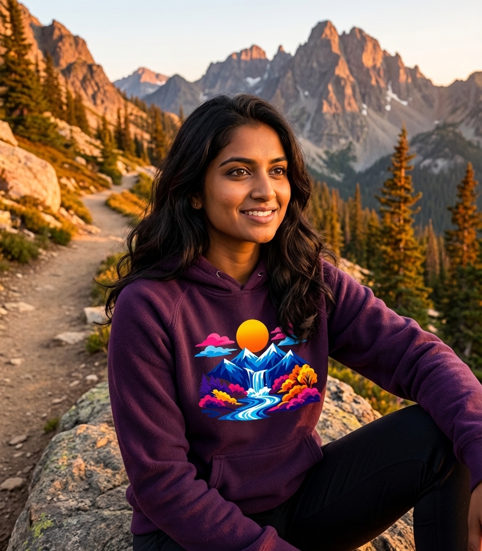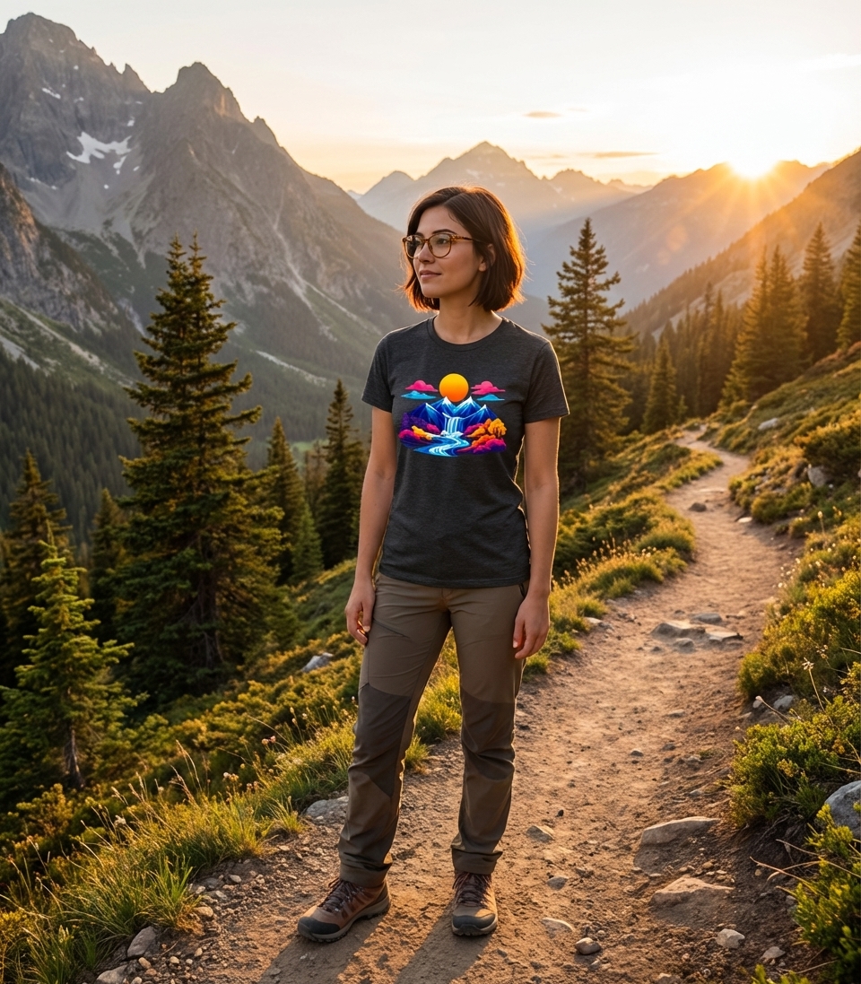 This vibrant mountain landscape design captures the awe and wonder of outdoor adventurers who spend their days exploring trails, admiring waterfalls, and enjoying colorful wilderness.