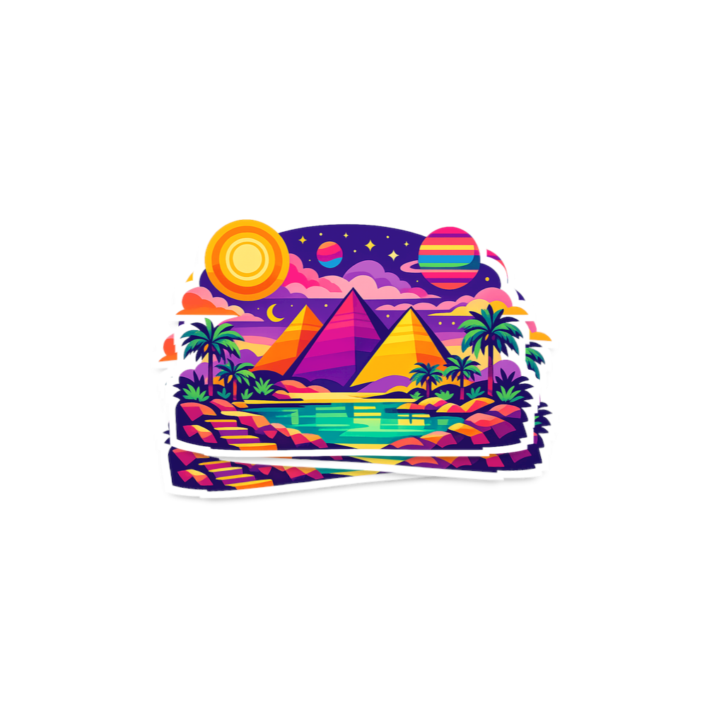 This design showcases a fantastical desert landscape, bringing together ancient wonders with a cosmic, futuristic twist. Majestic pyramids stand under a vibrant sky, where multiple celestial bodies illuminate a serene oasis.