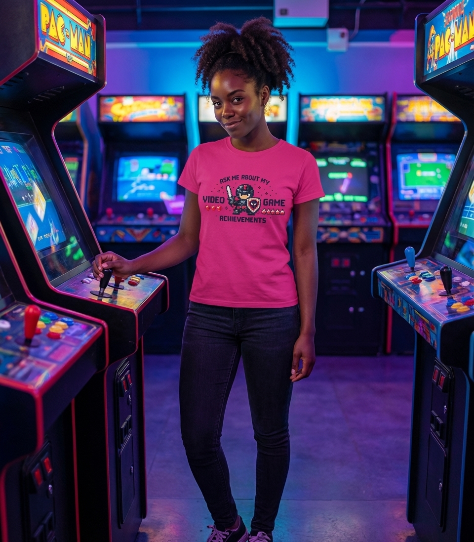 The phrase 'Ask Me About My Video Game Achievements' is a humorous declaration of a gamer's dedication and skill. It invites conversation about the often-hard-earned milestones and triumphs experienced within virtual worlds. This is a common lighthearted boast within the gaming community.