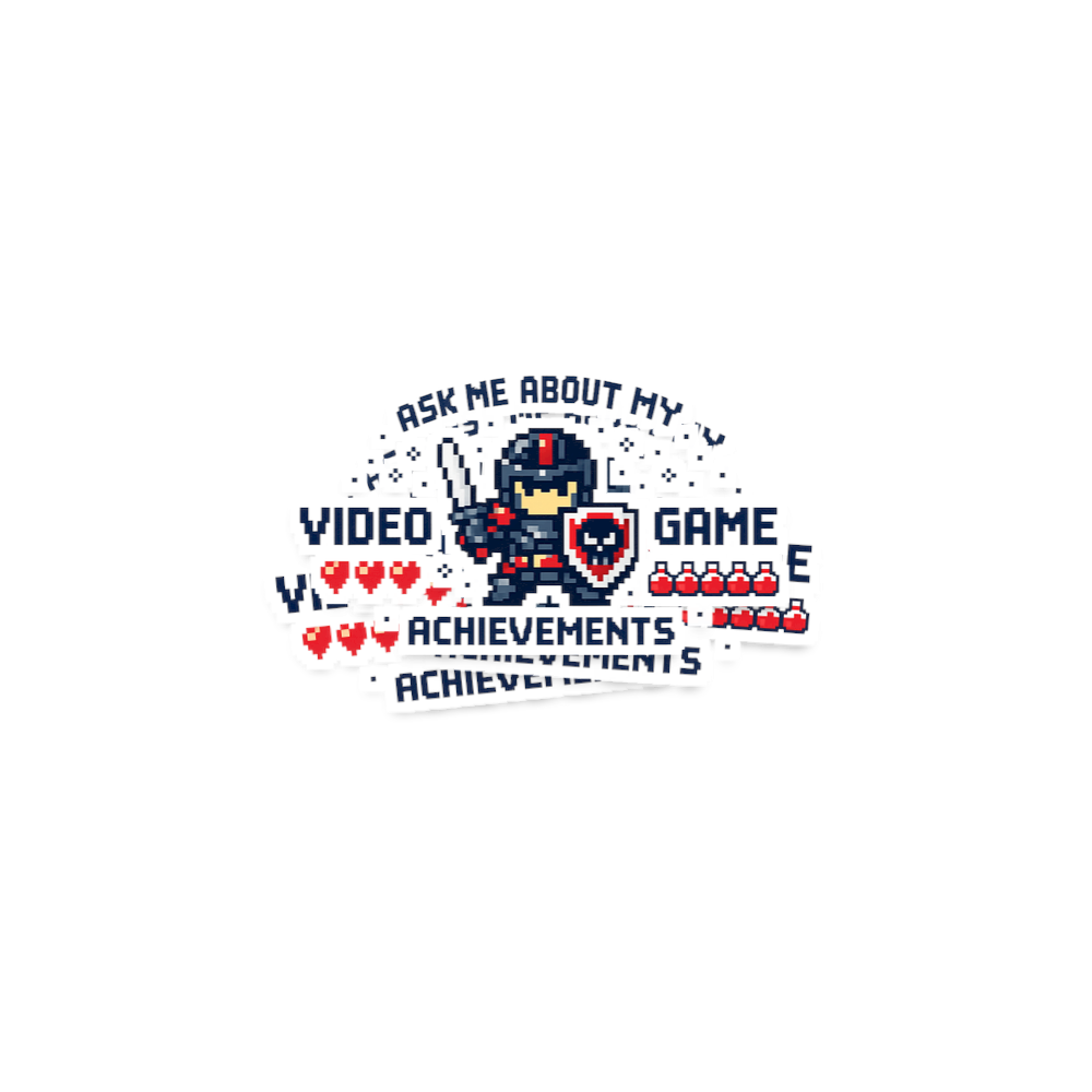 This artwork features a charming pixel art knight, complete with a sword and shield, set against a dark background. The retro aesthetic pays homage to classic 8-bit video games. It captures the essence of a proud gamer ready to showcase their in-game accomplishments.