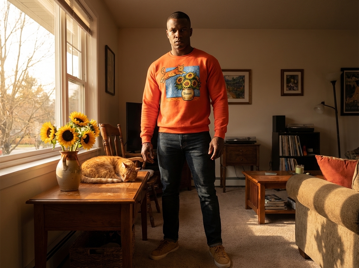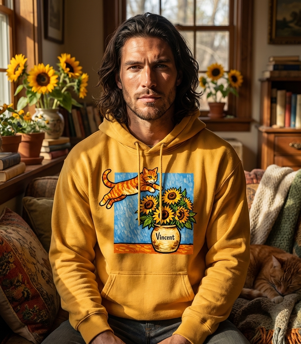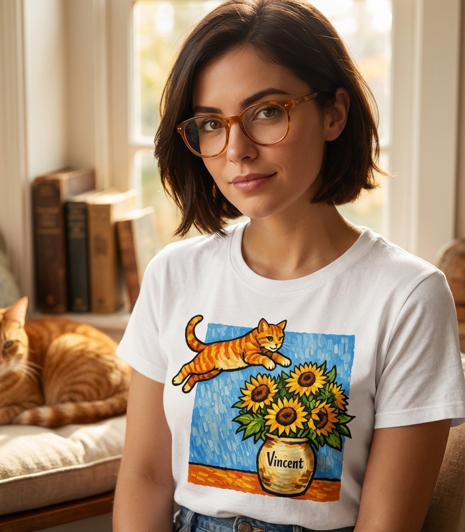 The name "Vincent" on the vase is a direct tribute to the famous Dutch painter Vincent van Gogh, renowned for his "Sunflowers" series. This design humorously reinterprets a classic art piece by introducing a mischievous feline, blending art history with contemporary pet adoration.