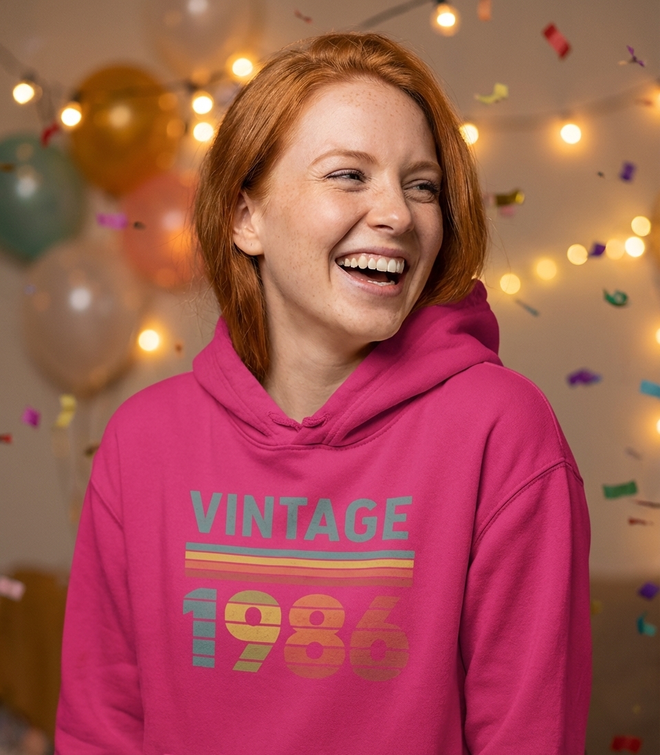 The 'Vintage 1986' design celebrates the enduring spirit of those born in 1986, capturing their classic style and nostalgic connection to the vibrant eighties era.