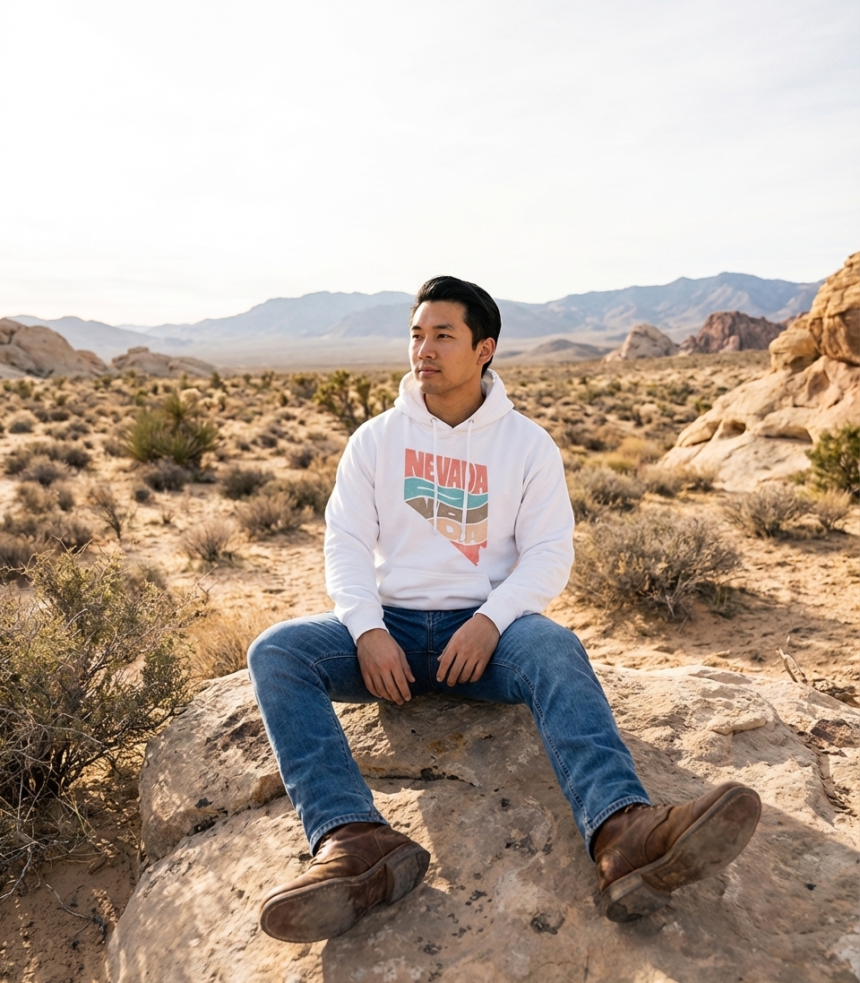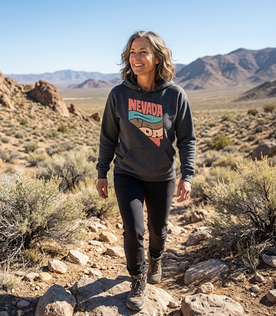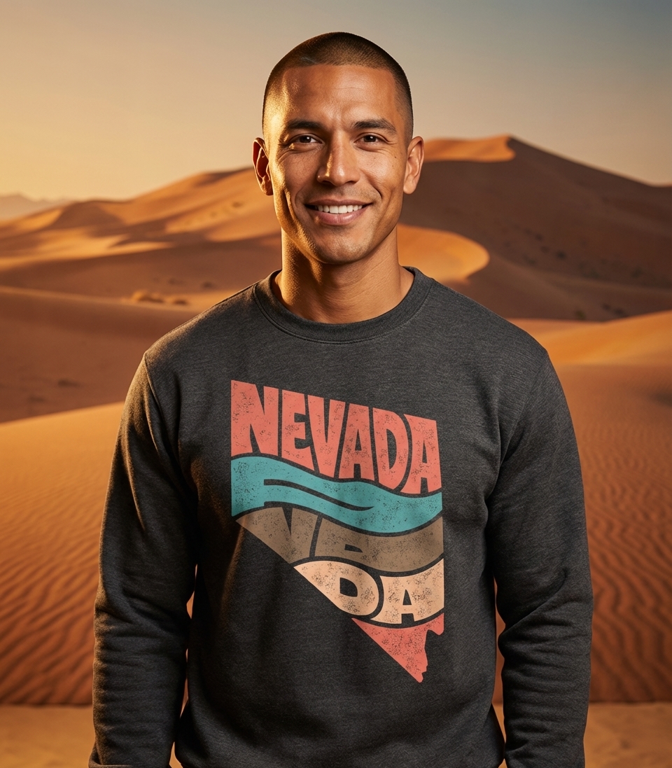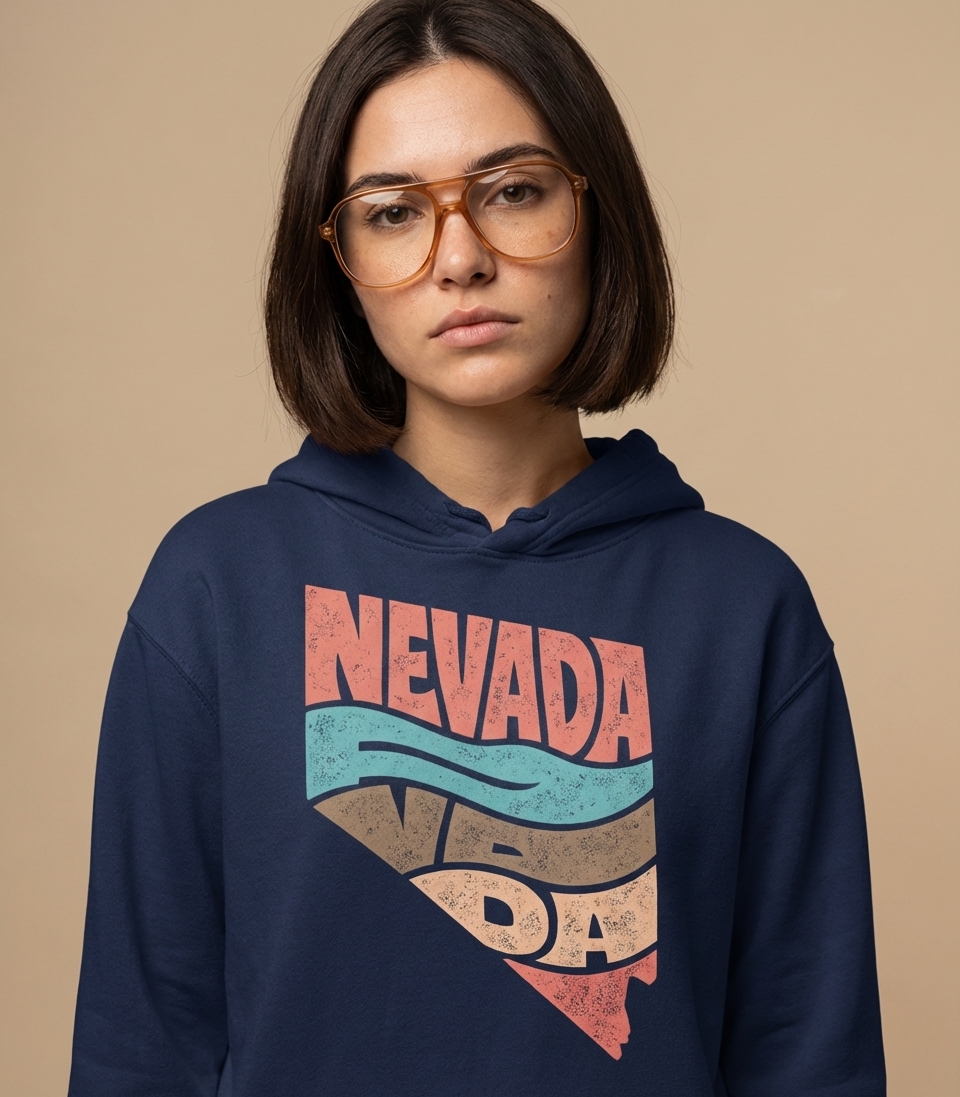 The phrase "NEVADA" directly signifies the U.S. state, known as the Silver State. This design is a declaration of pride and affection for its unique culture, desert beauty, and vibrant cities.
