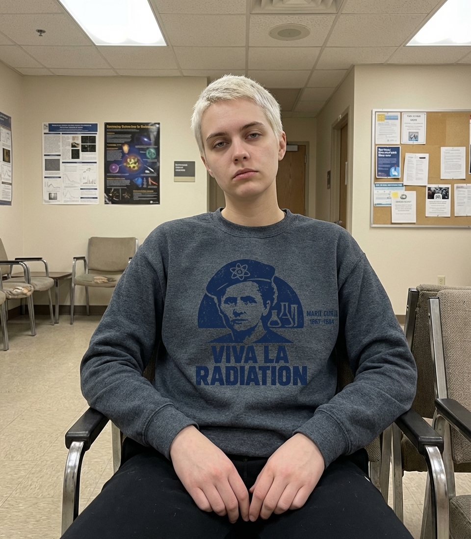 The phrase "Viva La Radiation" is a dark, witty homage to Marie Curie's pioneering work with radioactivity and its eventual tragic impact on her health. It’s a playful yet poignant statement that embraces the powerful, albeit dangerous, scientific discovery she championed.