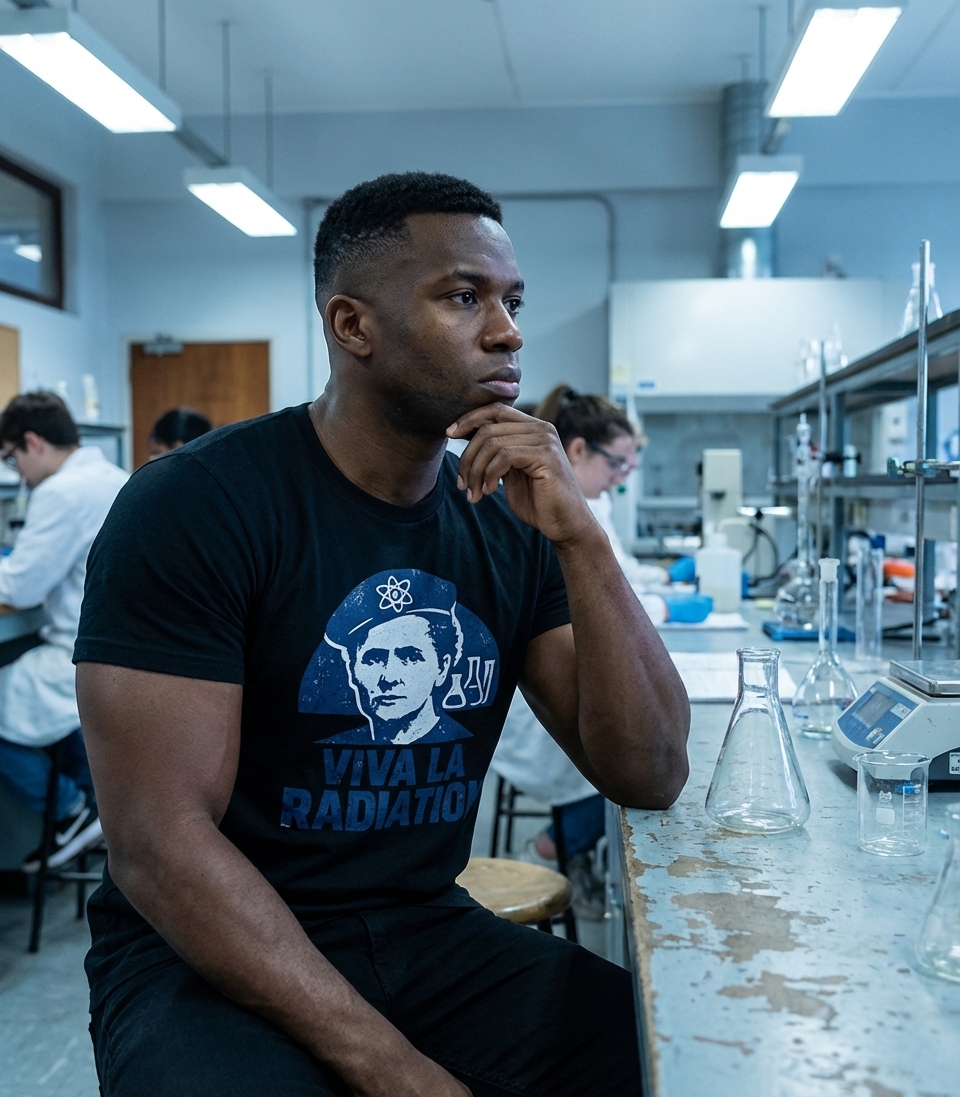 The 'Viva La Radiation' design celebrates the groundbreaking work of Marie Curie, captivating science enthusiasts, physics students, and history buffs with its revolutionary spirit.