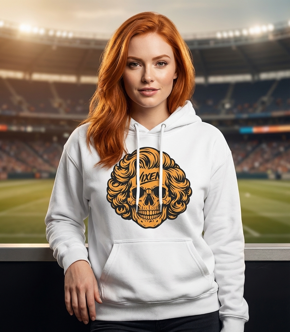 This striking graphic features a stylized skull adorned with an iconic blonde, curly hairstyle. The word "VIXEN" is boldly displayed across its forehead, making a strong statement. The artwork combines classic glam with an edgy aesthetic.