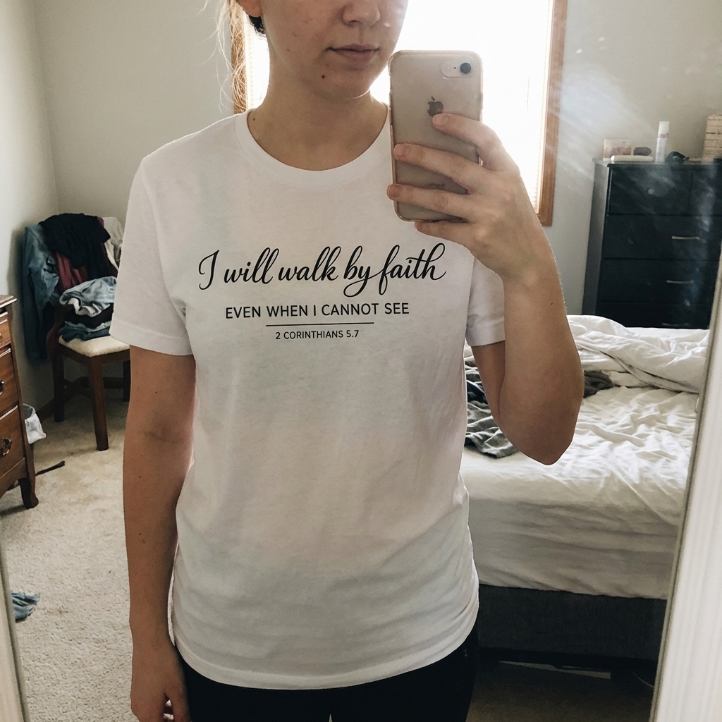 The 'I will walk by faith' phrase captures the lifestyle of passionate Christians who navigate life's uncertainties, finding strength and guidance in their spiritual trust.