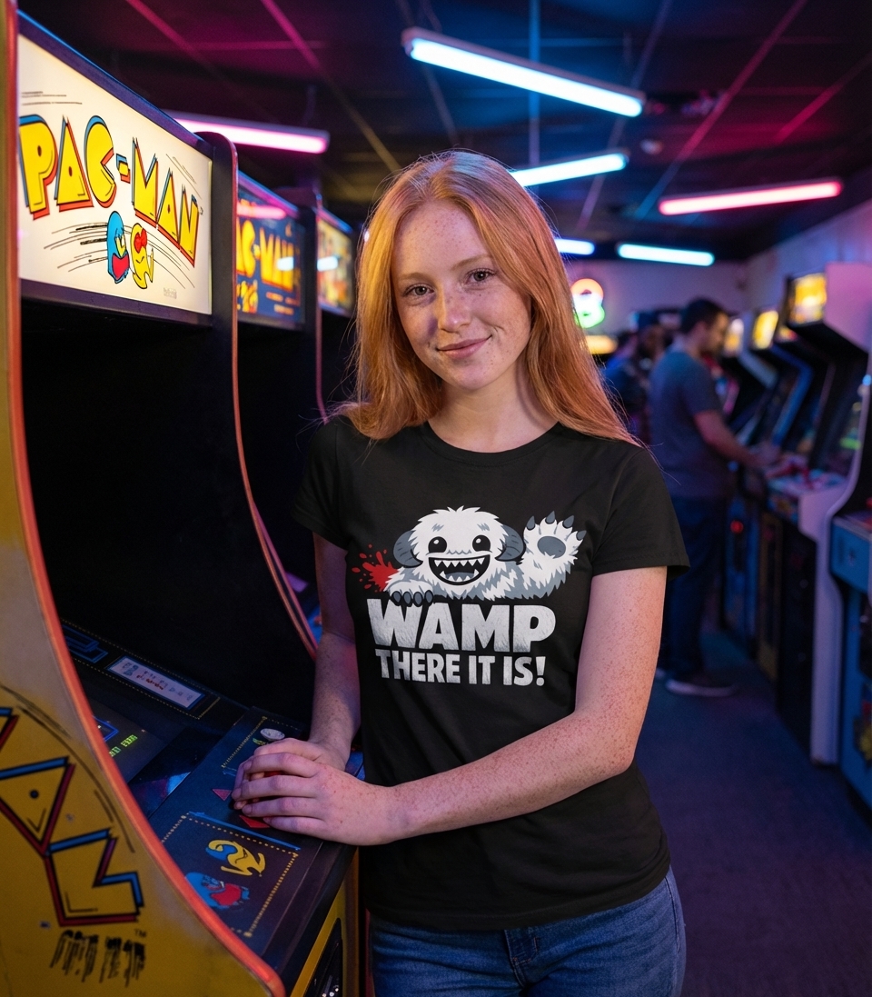 The phrase "WAMP THERE IT IS!" is a clever pun combining the name of the classic Star Wars creature, the Wampa, with the infectious chorus from the 90s hit song "Whoomp! (There It Is)". It evokes a sense of sudden appearance or declaration, delivered with a mischievous, monster-sized grin.