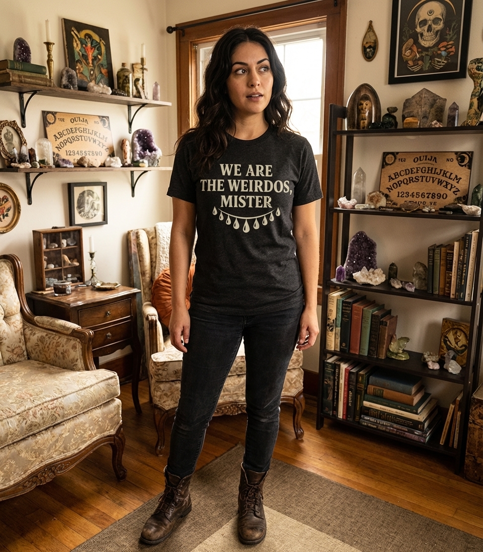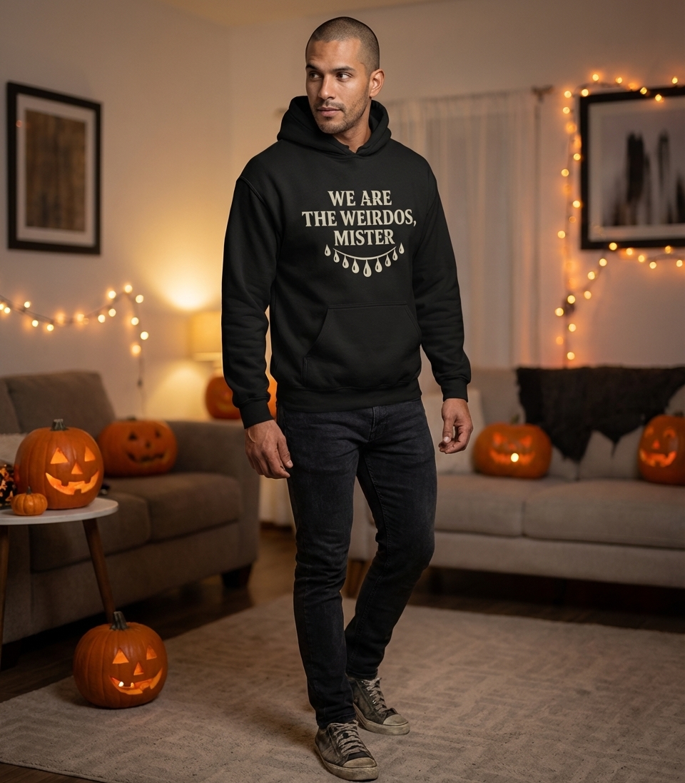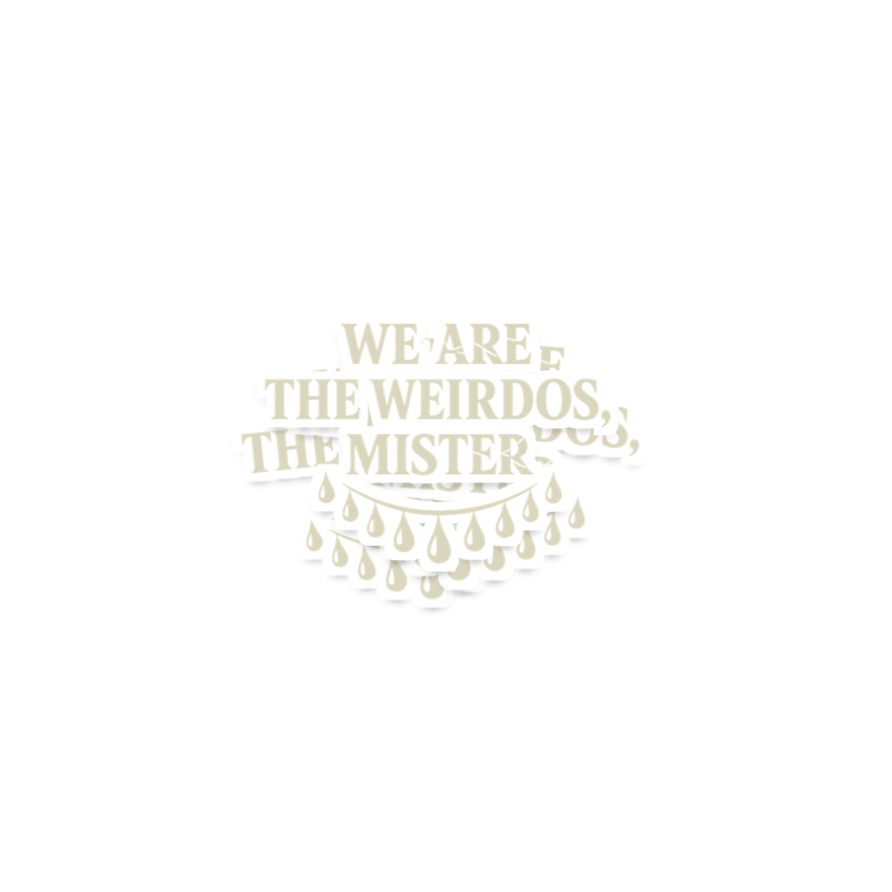 This striking design features the iconic phrase "We Are The Weirdos, Mister" in a distressed, vintage-style font. Below the text, a garland of dripping teardrop shapes adds a touch of melancholic charm and gothic appeal. It's a powerful statement piece for those who march to the beat of their own drum.