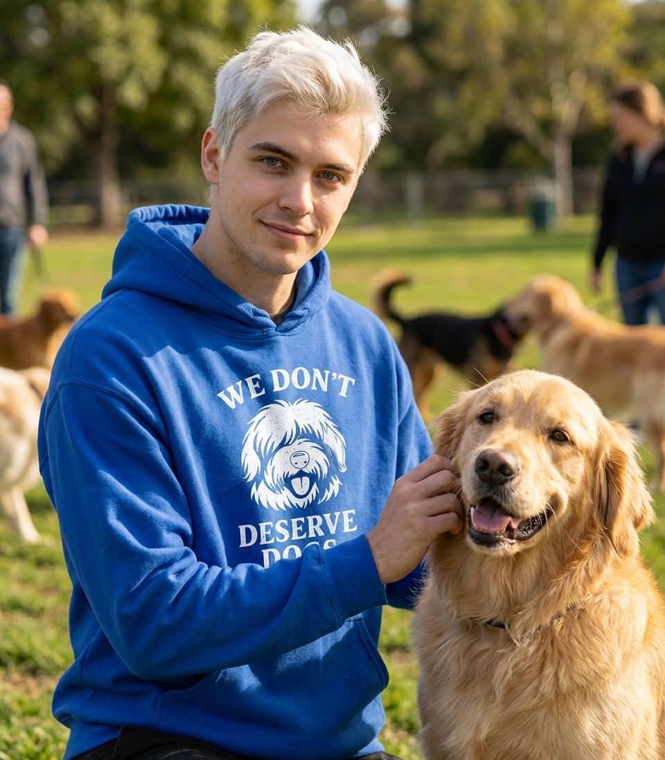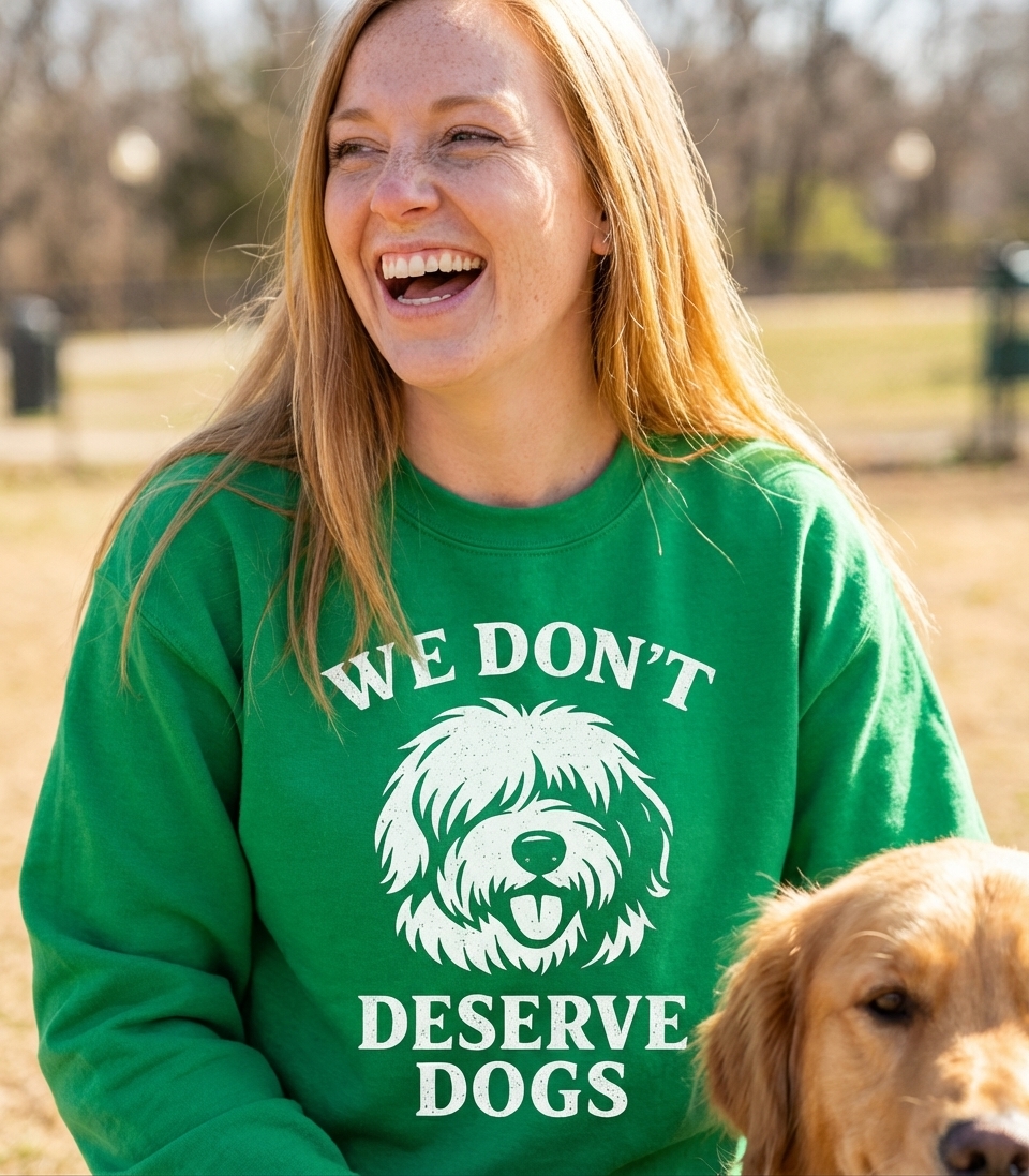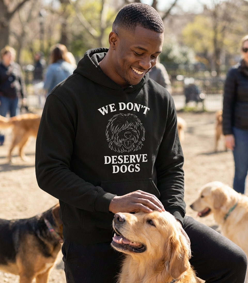 The 'We Don't Deserve Dogs' phrase captures the lifestyle of passionate dog lovers who cherish their furry companions, appreciate their unconditional love, and often feel humbled by their goodness.