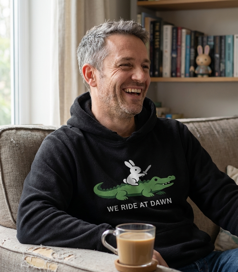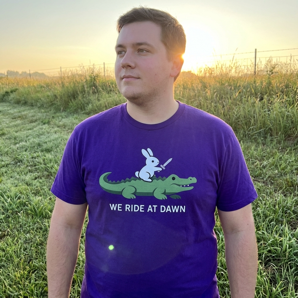 The phrase "We Ride at Dawn" typically signifies readiness, determination, and a shared commitment to an upcoming journey or challenge. In this humorous context, it takes on a playful and ironic tone, given the unlikely pairing of a bunny and an alligator preparing for an adventure.