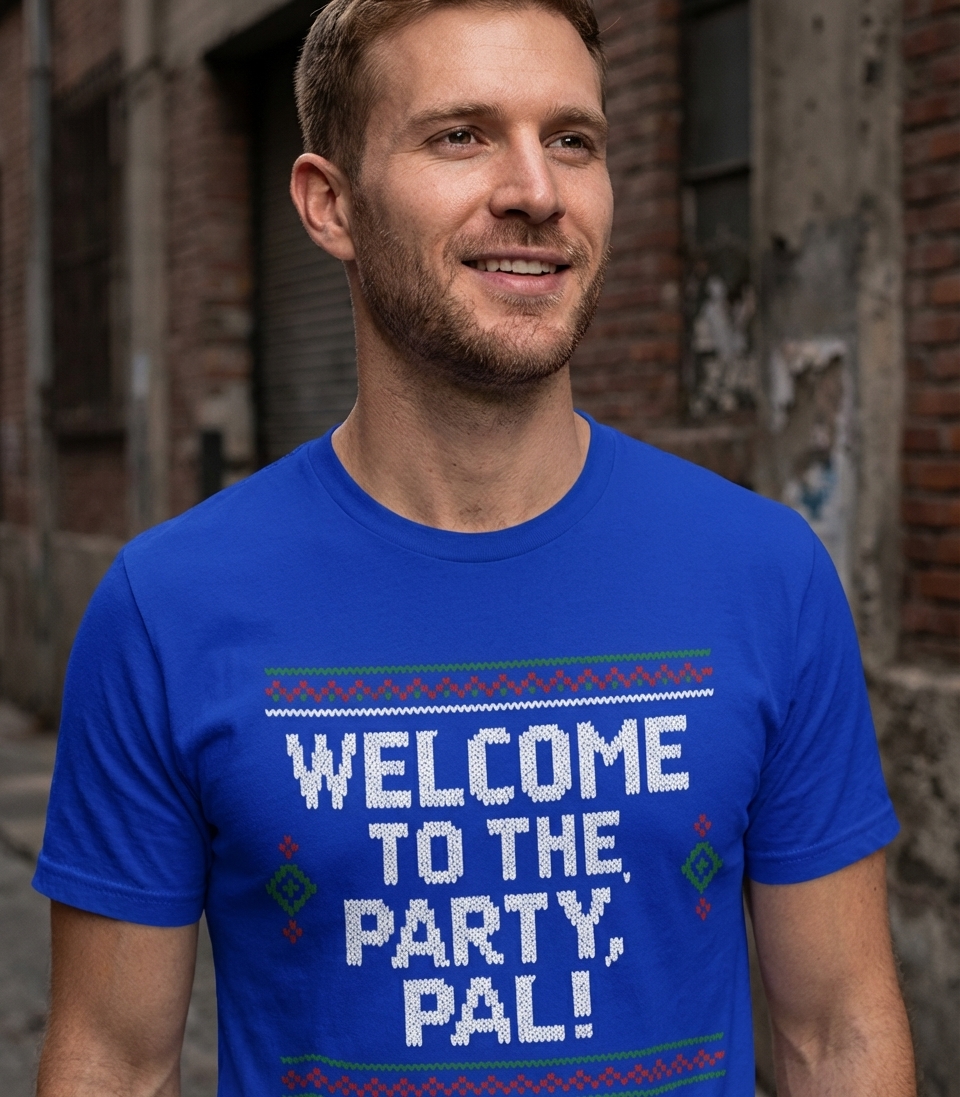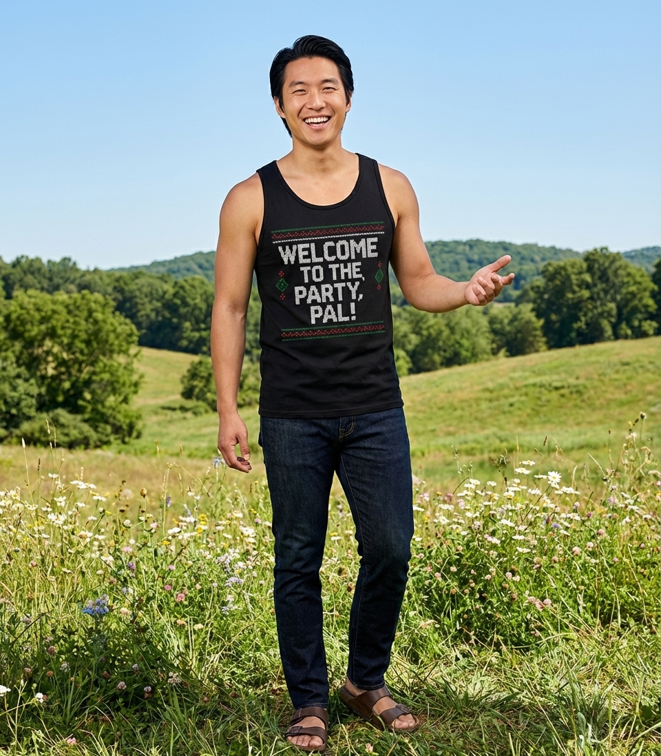 Elevate your Graphic collection with Welcome To The Party, Pal! Men's Relaxed Fit Tee on a Tank Top! Generated via Design Mixer.