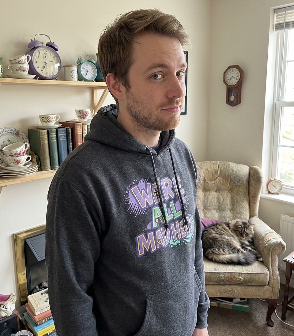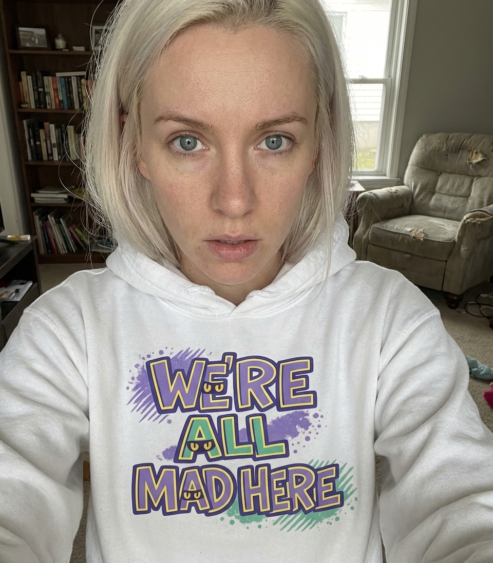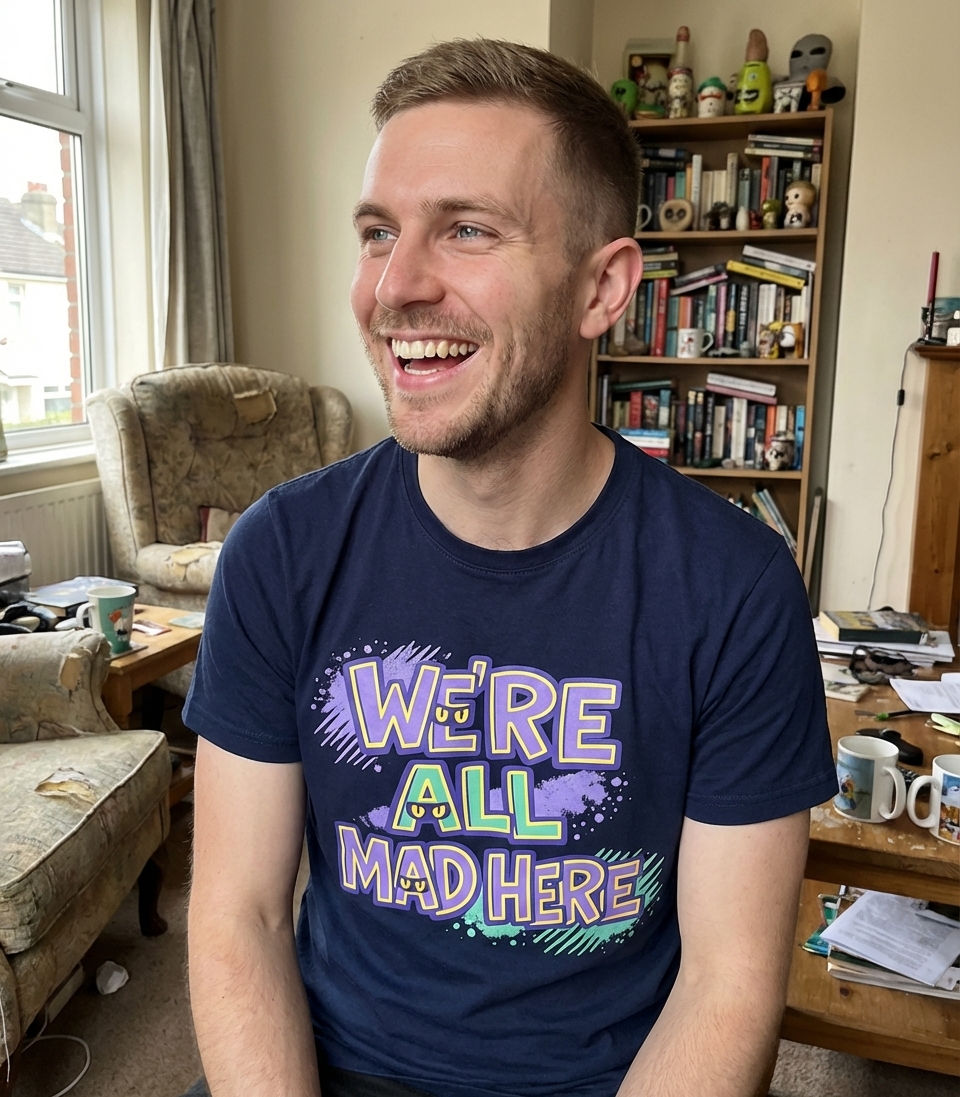 The "We're All Mad Here" phrase captures the lifestyle of quirky individuals who embrace their unique perspectives, find humor in the absurd, and cherish classic literary references.