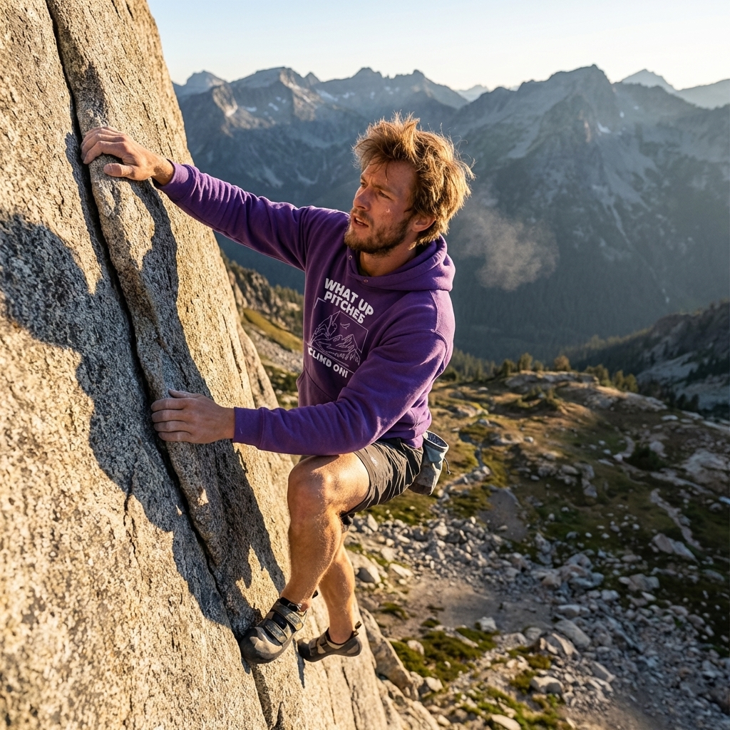 The 'What Up Pitches Climb On' phrase captures the lifestyle of passionate rock climbers who spend their days scaling cliffs, conquering routes, and enjoying mountain vistas.